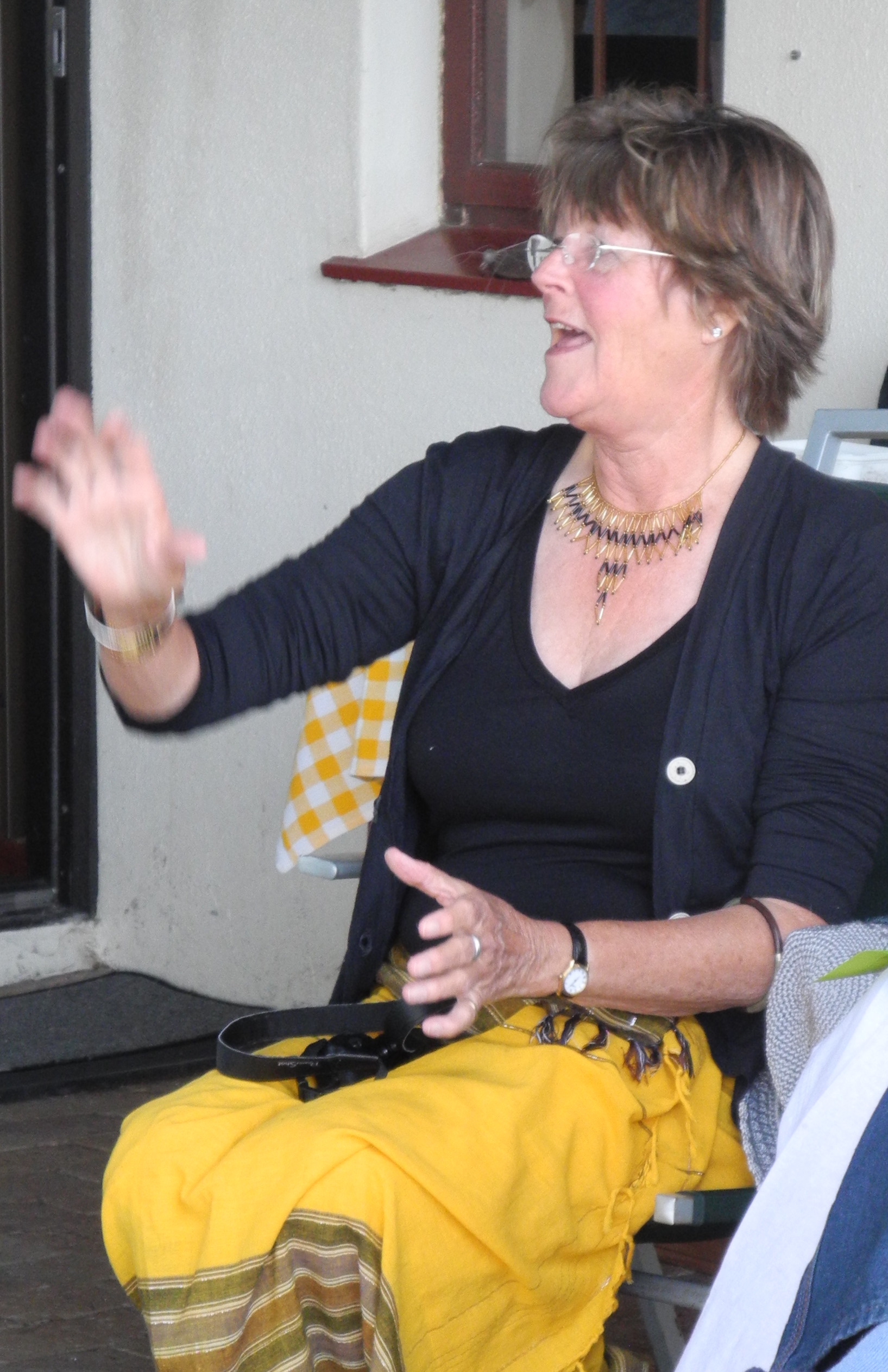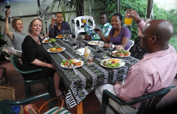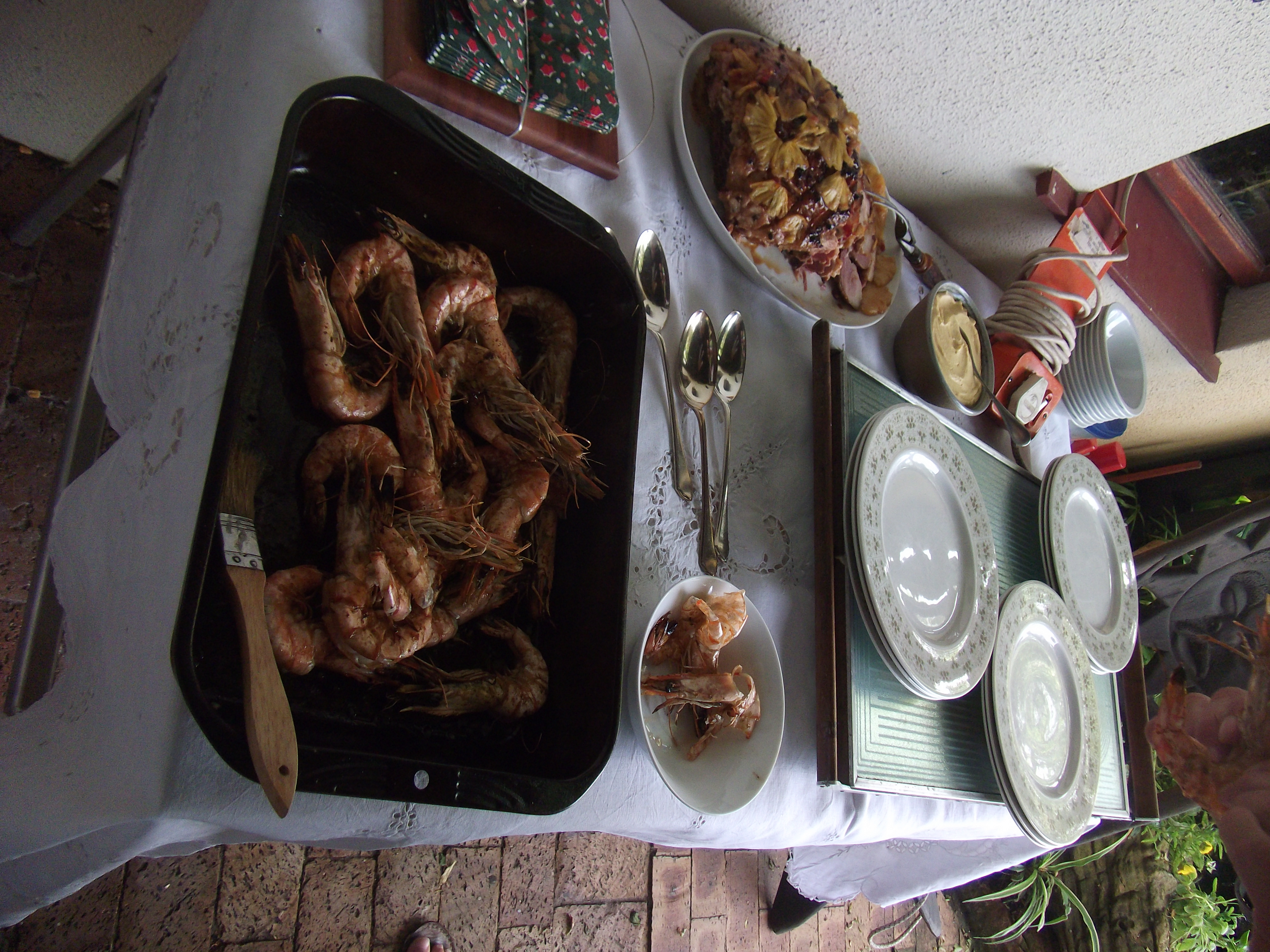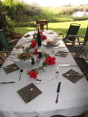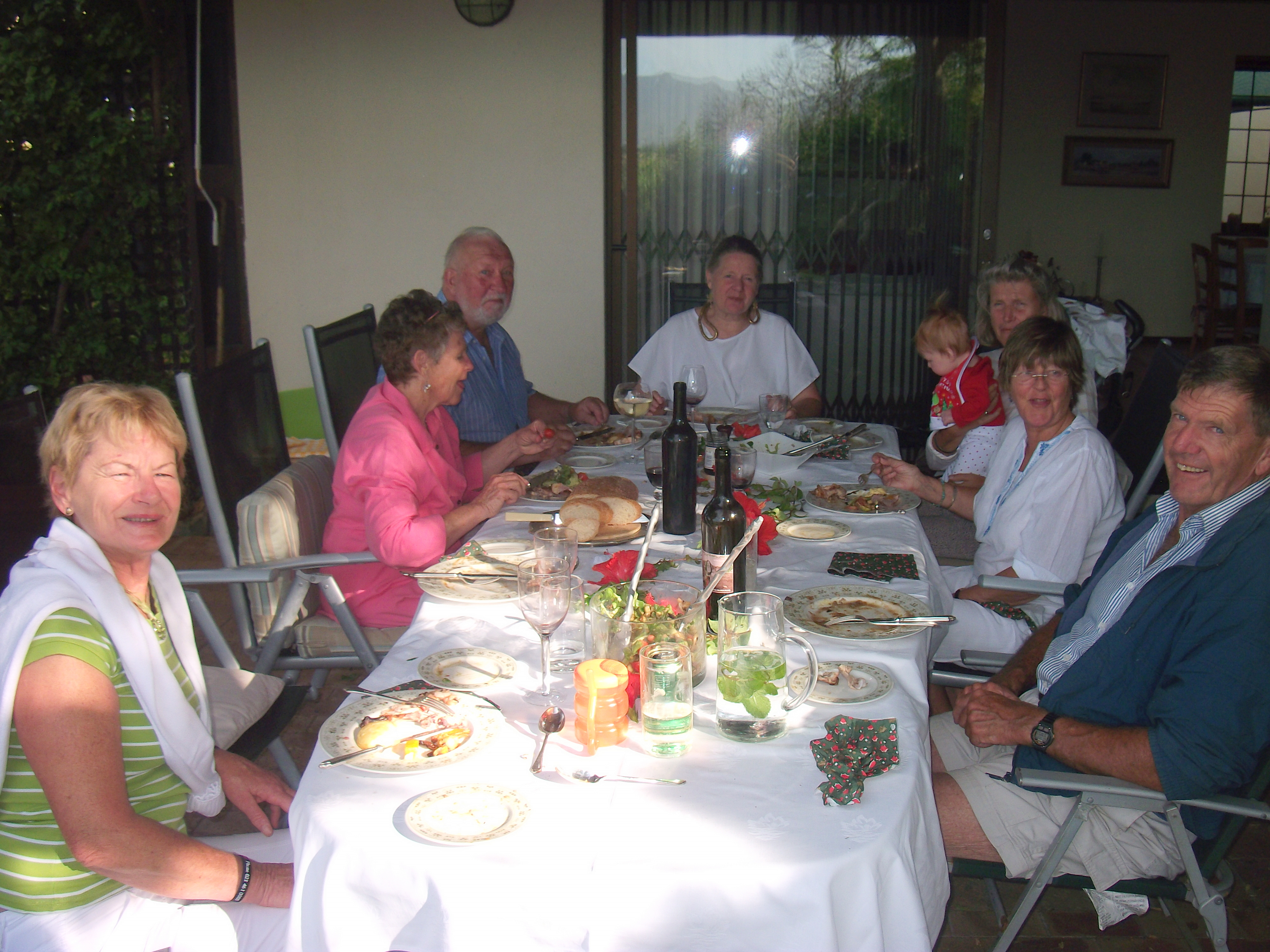 We gathered for dinner early, 4.30pn, to accommodate the baby Mains and I arrived to find festive tables laden with goodies set up in the garden with the wonderful view of the wetlands and table mountain in the backgrownd (see to of page).