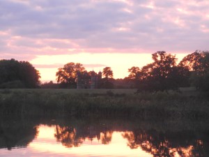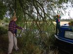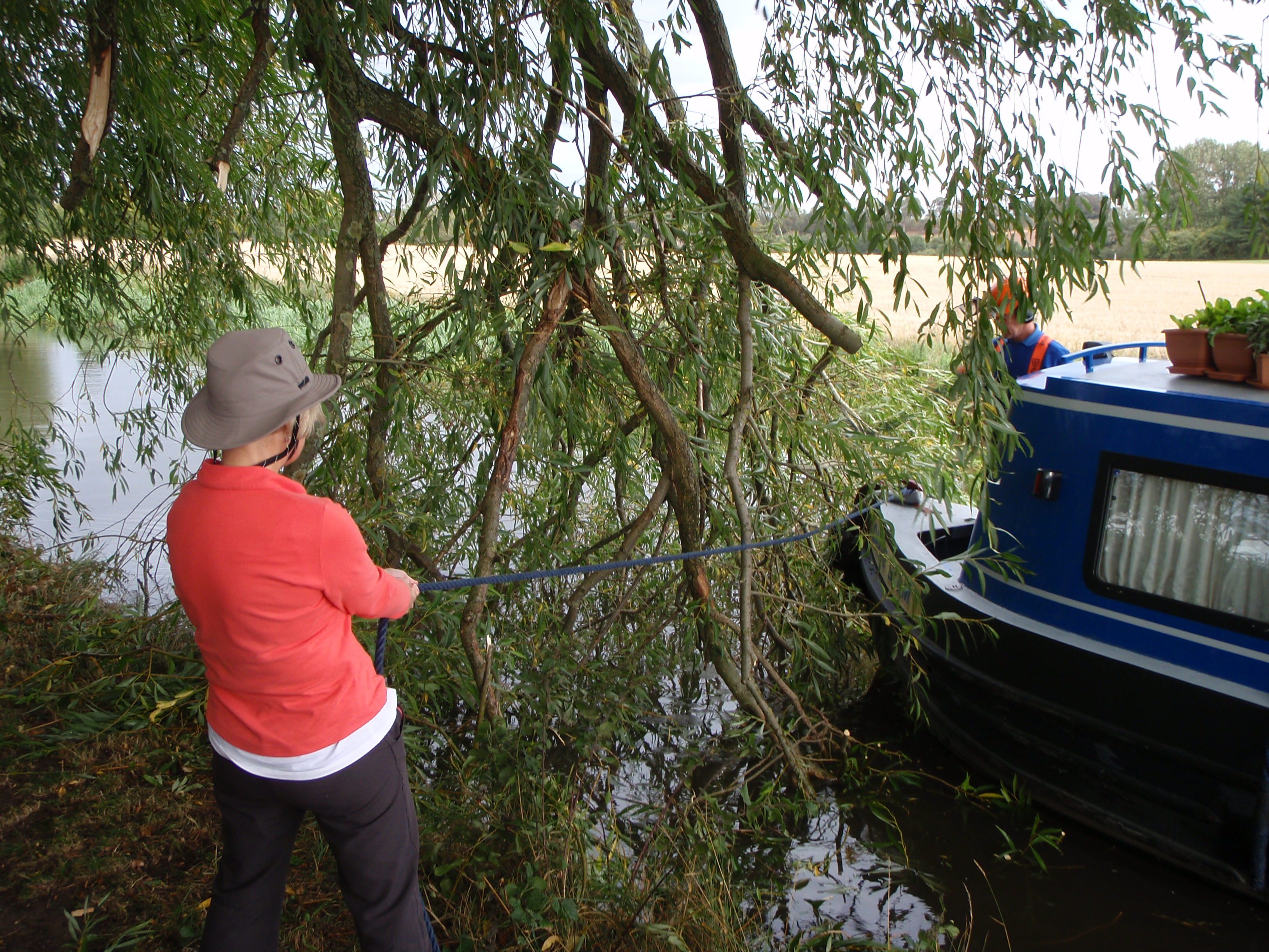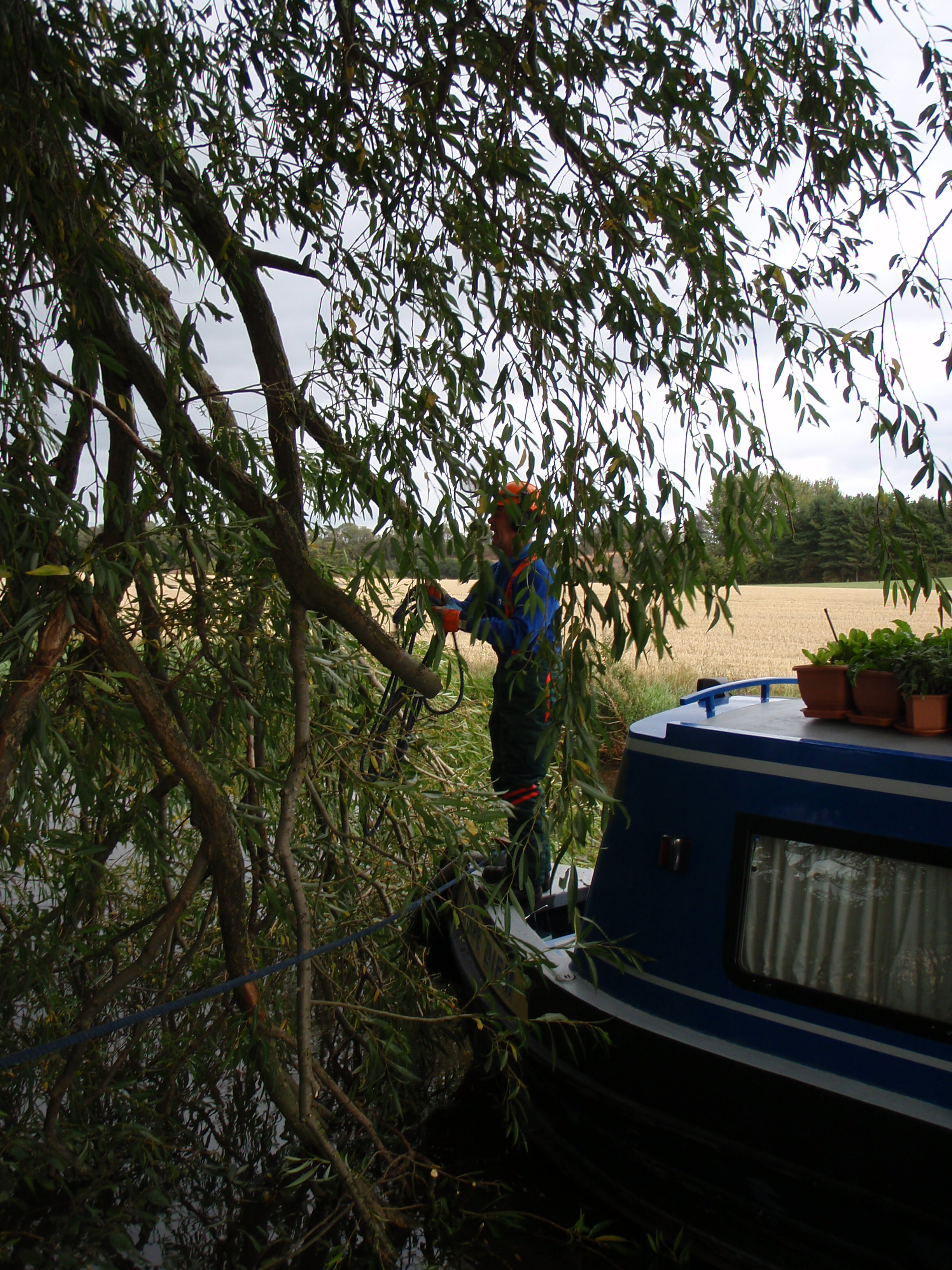 14th September. Went through the lock, turned, took on water and emptied the loo bucket (just joking – about it being a bucket that is!) went back through the lock and moored up to wait for my guests. Walked into town and met them coming off the train which was just as well as they had left my phone number behind. Set off as soon as we got back to the boat as I wanted to moor up in the Tixal Wide again this evening and take them to Shrugborough Hall tomorrow. The trip took longer than expect as there was a Willoe tree down that was blocking the canal. The British Waterways men (Boys in Blue) arrived from the opposite side at the same time as we did so once we had fed them tea (no jokes about British workmen now!) They used the prow of my boat as platform from which to clear branches away so that we could pass through.