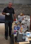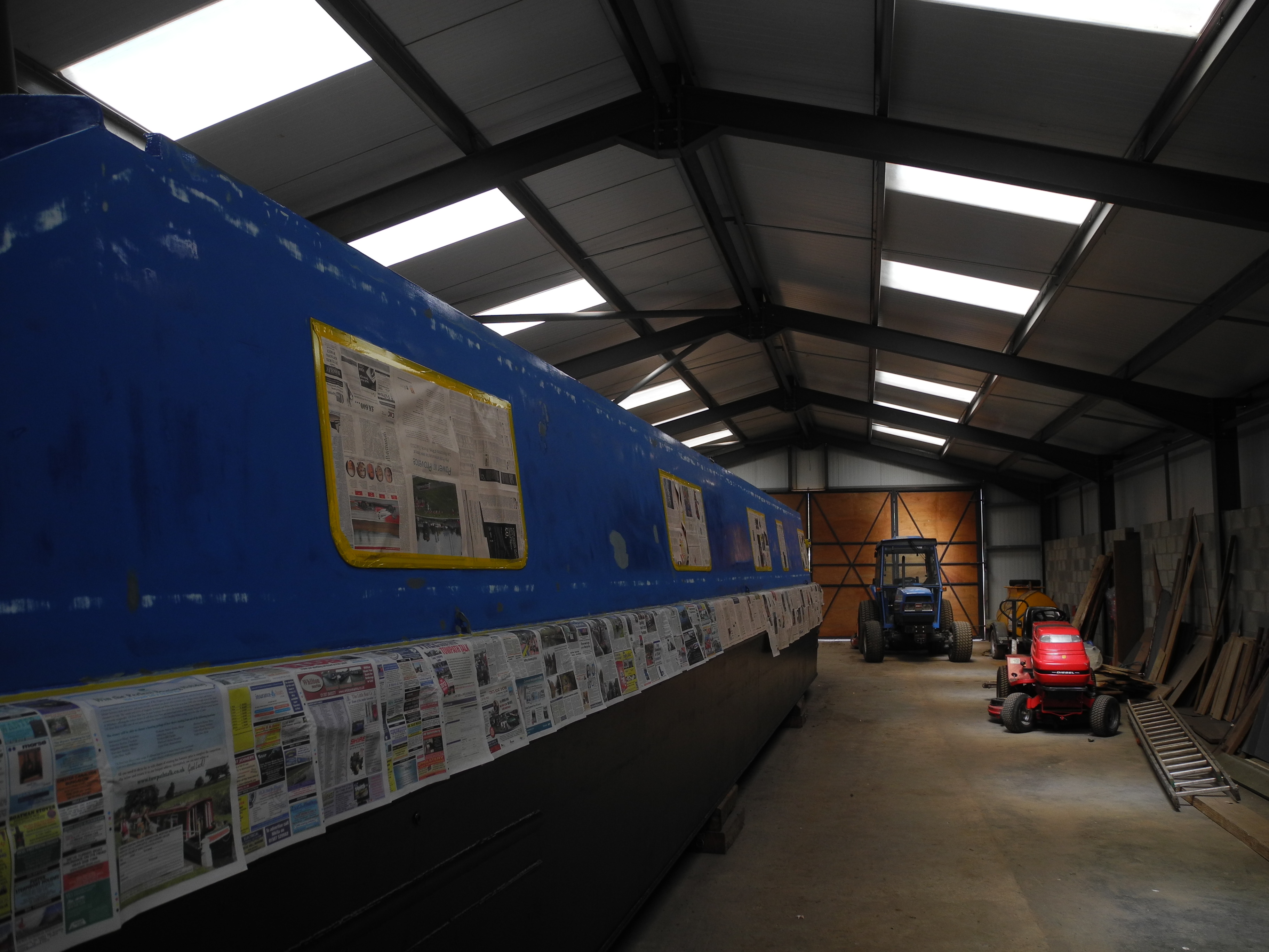 23rd May. Jon and I got to work on the boat today. He has bought a fancy sanding machine and by the end of the day we had all the machine and detail sanding done and had masked one side.