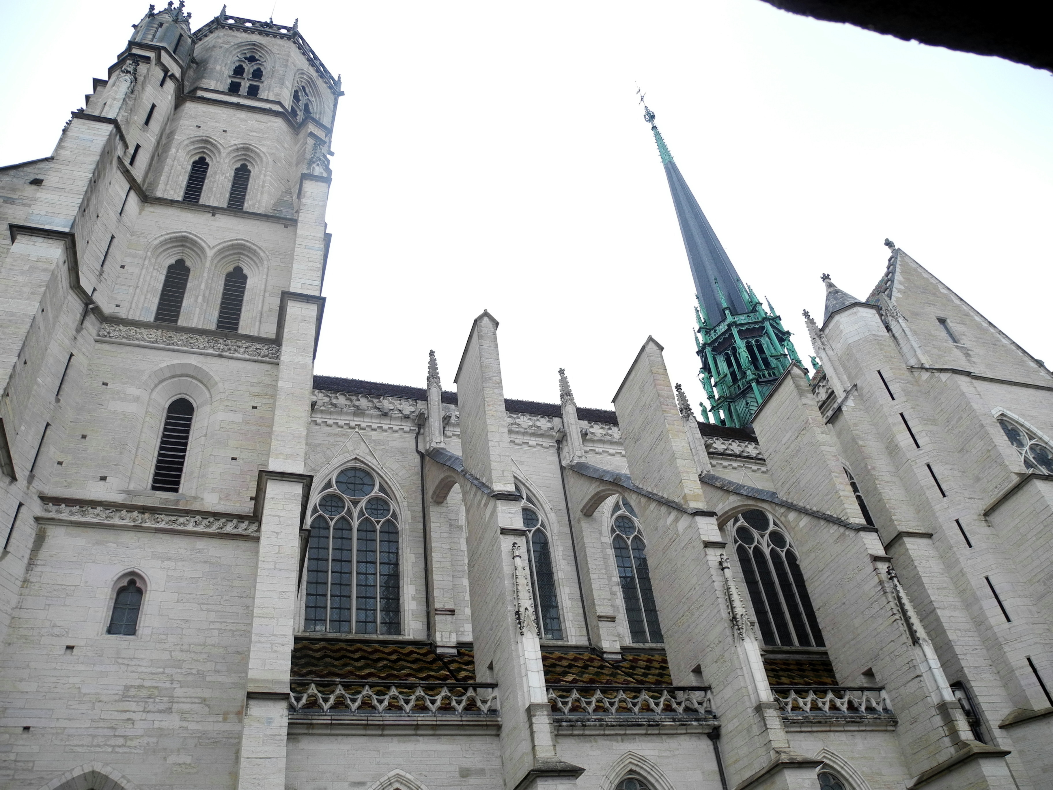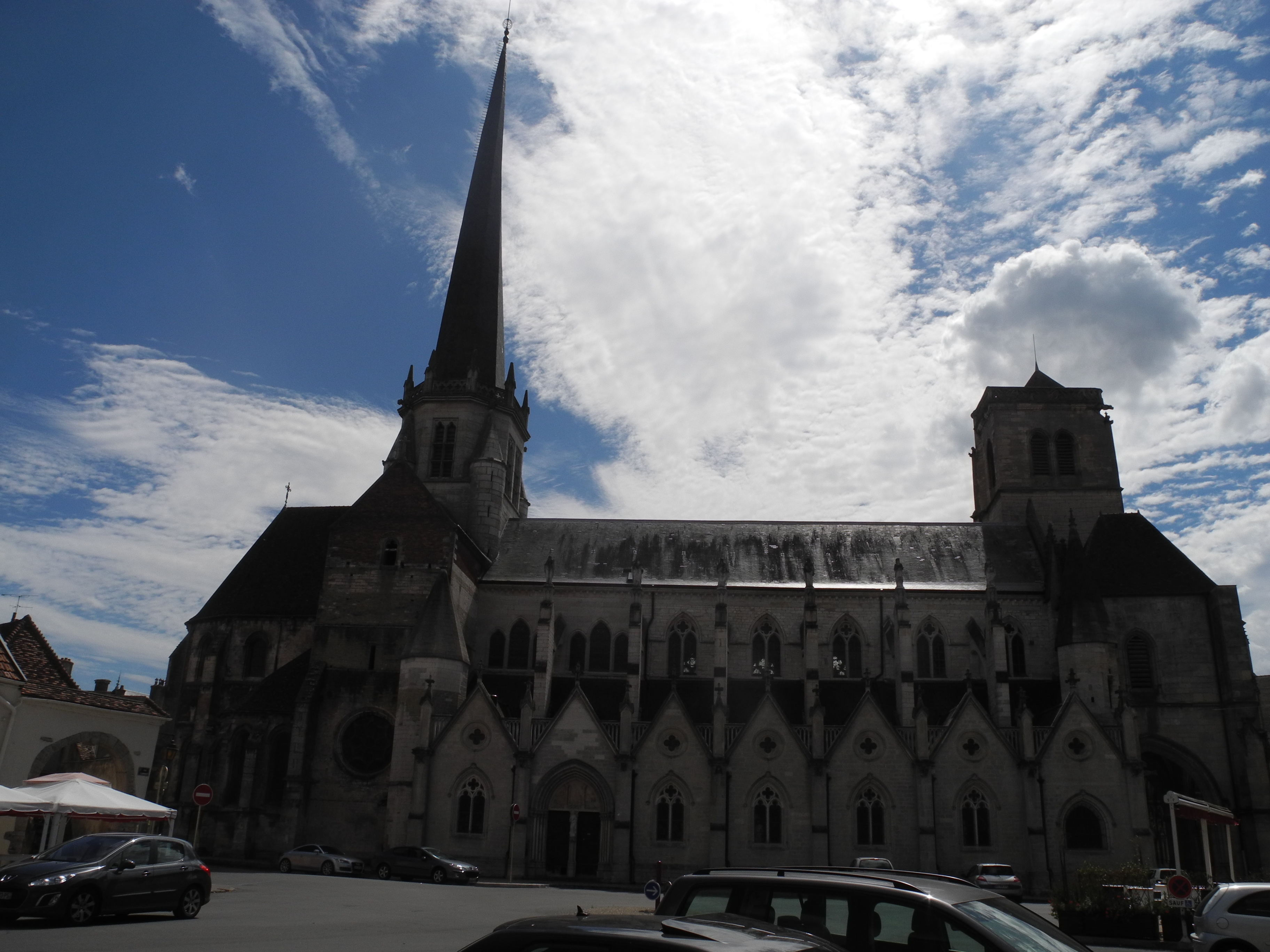Saturday 24th. The day started off rainy which wasn’t a major draw back as we were headed for sightseeing in Dijon. We didn’t get a very early start so it was pretty much lunch time by the time we had parked the car. On our way to find somewhere to eat we stopped to have a look at St Benigne Cathedral of Dijon. This large Romanesque church predominantly dates from the 12/13 centuries but the crytp dates back to the C11 and includes a mortuary chapel dating from the C6. Parts of the roof feature the coloured tiles that are so much a part of burgundy.