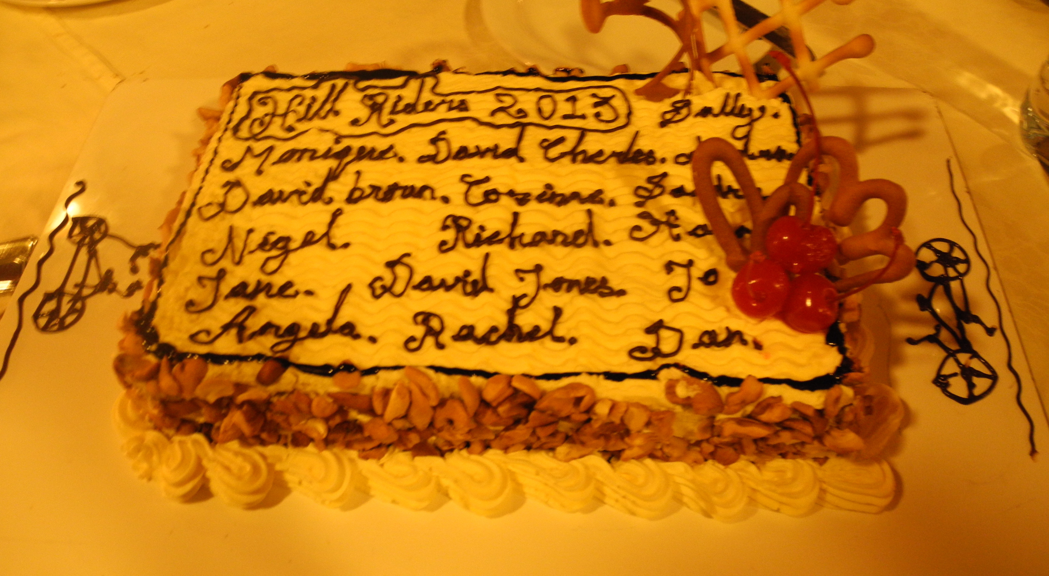 At dinner Suresh presented us with a King of the Hill cake with bike on and all our names. Even mine although I had not cycled. A lovely touch.
