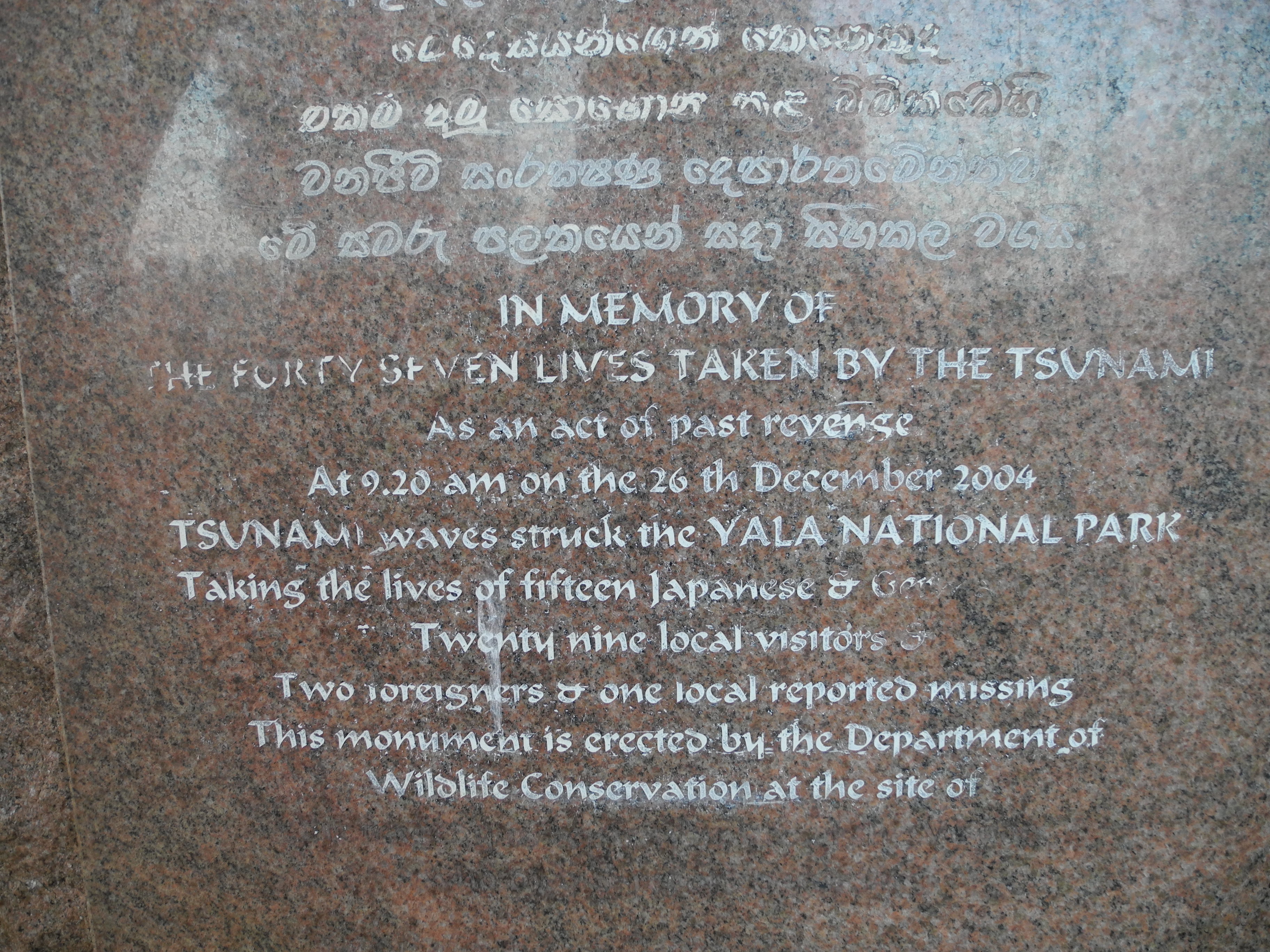 5th November The day started with a short ride round the lake. There was plenty of bird life including pea-cocks which are prolific in this area. There were also fruit bats. 40k later we were back in the hotel for lunch and time out prior to leaving on a game drive at 2.30pm. We had a maniac driver whose sole purpose seemed to be to get to the end of the drive as fast as possible. The most exciting things we saw were a painted stork and a bush pig. At the turn around point we saw the memorial to the people who had been killed in that area by the Tsunami and were reminded that 55,000 Sri Lankans lost their lives on that fateful day in 2004.