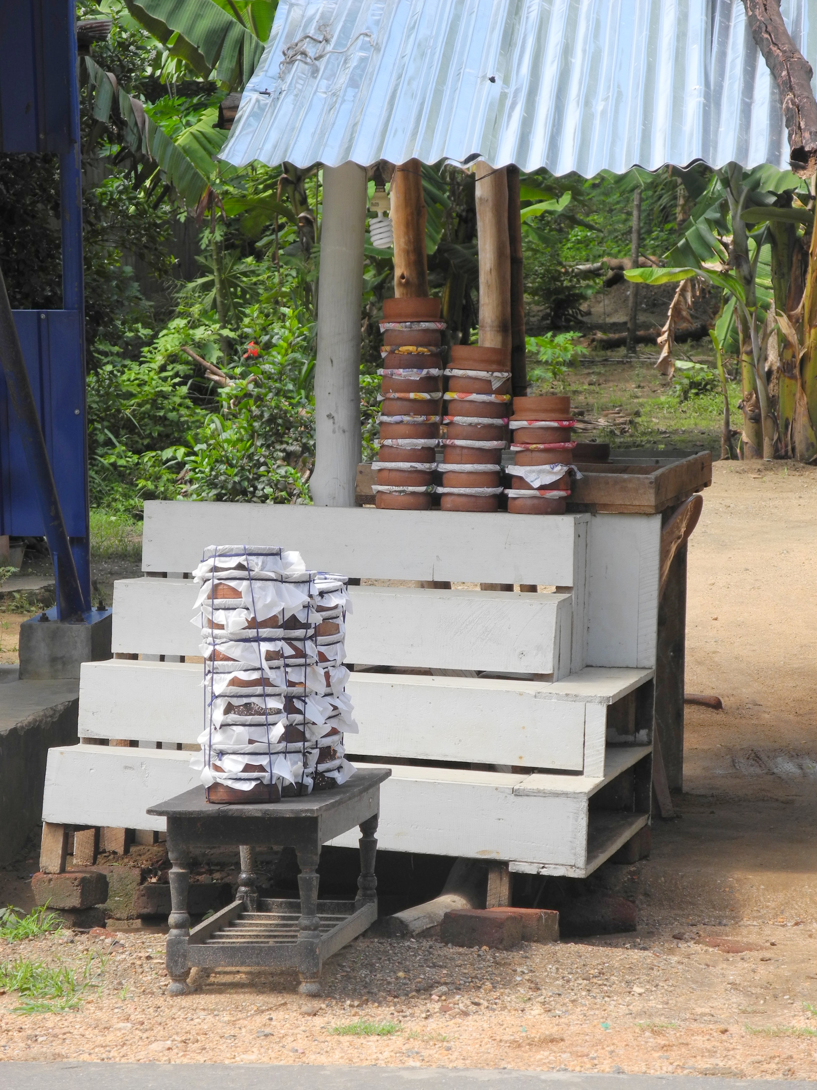 Andy got the “max-dam” award and wore it with aplomb as we set off for what would be a long day for the cyclists. I had decided to give the knees a rest and ride in the bike truck. Although not air-conditioned it drives at the back slowly and doesn’t mind stopping for photos.  One of the item along the road that merited a photo was the curd containers that in this area were composed of clay pots stacked one on top of the other and tied together with string.