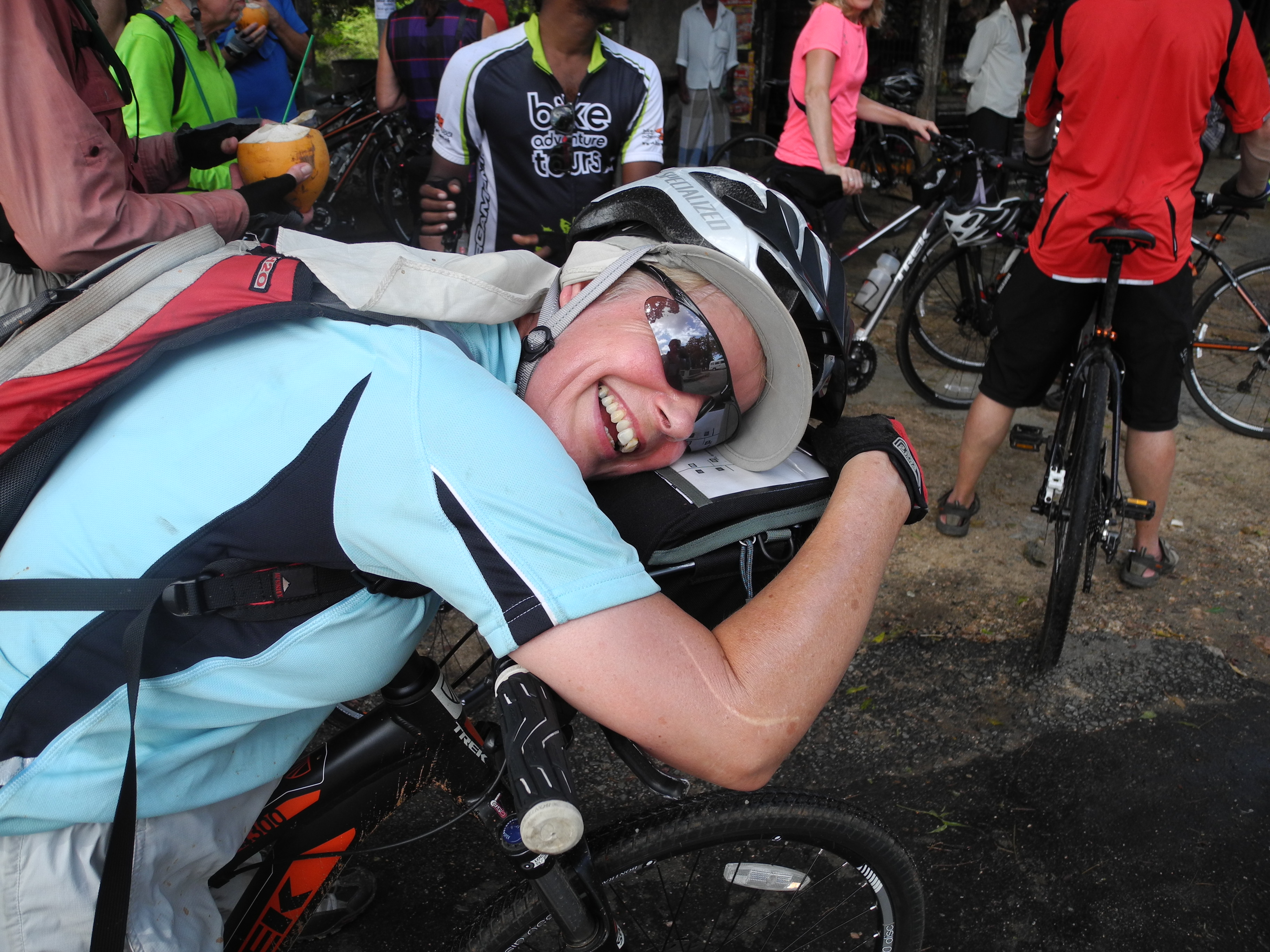 Over the coming days, we cycled main roads, back roads, anddirt paths.  A simple taxonomy of things encountered could be divided into two groups – things with horns and things without.     These motorized horns have either two,three, four, or six wheels.     The things without horns have either two flip-flops, two pedals, four paws and tail, or four hoofs and tail. Dogs, secure in their knowledge they live in aBuddhist land, choose to nap in the middle of roads.  This napping and mobile menagerie engages in a street symphony that fits multiples of things on lanes meant for one with near collisions at intersections adjudicated by the staccato of horns and quick reflexes, not traffic signals.   One day we climbed more than 3000 feet to the cool highlands of tea country and the following we rocketed back to the lowland oven of heat.    We taught schoolchildren a game with strings, climbed rocks, fed elephants and chased whales.    We nicked guitars from hotels bands and damaged the art of songwriting.   We awarded a “tiara of distinction” for best stunt of the day to be proudly worn the following. Two weeks of sweat – now a memory.