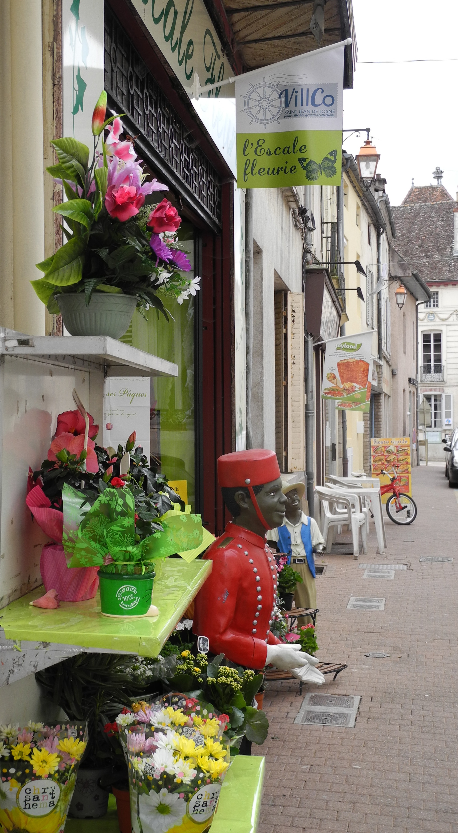 4th April. Lovely lunch at “Labbayott” Farm, home of Jane and Robert, for Roberts Mum’s big eight-oh birthday.  Wonderful food, good company and a lovely setting in the countryside next to the Canal de Bourgogne. DSC00305   DSC00304   DSC00303   DSC00302The venue was the new flat built into the roof of the great old barn. Through the open window you can see down into the lower level with  the blacksmith shoeing one of the horses. DSC00313   7th April. Today Jacquie, Bob, Steph and I went to the town of Louhans to see the market. It is an interesting town accessible by boat on a dead-end off the Soanne. One sector of the market had animals and fowl that were available to buy as even pets or candidates for the pot! colourful birds through to huge rabbits from Flanders and a demonic looking young kid! DSCN5674   DSCN5675   DSCN5679   DSCN5678 If you look up you see the diversity of the architecture. DSCN5695   DSCN5697   DSCN5704   DSCN5706 Other stalls sold cheese, sausage, honey,meat, vegetables and the biggest attraction of the area, Bresse poultry, both cooked as a take-away item and raw. DSCN5688   DSCN5687 DSCN5699  DSCN5689 Furniture, clothing, curtains, clocks and baskets! DSCN5686DSCN5691  On the edges of town the handsome houses are an indication of the wealth of the town. DSCN5713   DSCN5714   DSCN5715   We had parked by the cemetery and walked into town both of which featured interesting pollarded trees. DSCN5663   DSCN5690   On the way we went through a town where the church had a twisted spire (no doubt to go with the twisted…..well never mind!) DSCN5718   DSCN5719           ****************************************************************************** 16th April.  Time to tell you about the exciting developments that have been keeping me busy and away from the web page over the last few weeks. Social and educational activities abound in St Jean de Losne during the winter and range from Patchwork to Greeting Card making, Tia Chi to Country Walks and First Aid to Franglaise. The last of these was my choice and consisted of a two-hour session every Monday afternoon in the nearby village of St Auban where French and English people would meet to converse in each other’s languages and learn from the experience. Most of these activities slow down or stop for the Summer as the English-speaking boating community leaves the port and heads off cruising. However the French speakers expressed the desire to carry on so I picked up that baton and am now running the Summer Franglaise. I feel confident that others will be able to take over from me when my own boat is eventually in the water and ready to cruise. So that has been one of the additional strings to my bow that has consumed some time.   However the bigger new challenge has been being appointed to the pilot committee of VillCo. This is an association that has been set up to try to regenerate the town centre, add a new dimension to the town’s offerings, attract more all year round tourism and stimulate business. A tall order! The aim is to establish St Jean and its adjoining communes of Losne and St Usage as a centre for collectors. As a start we have gained entry to all the boarded up shops, cleaned up their windows, installed various tableau of collections in them and fed in direct lighting on timers to be paid for by the municipality. I have been personally responsible, with the help of some local French women for five of these windows (pictures to follow). Other businesses in town have been encouraged, and for the most part agreed, to put displays of collections in their own windows or inside their premises. We will probably be lifting the covers on them this week in preparation for the grand opening on the weekend of the 26th/27th which will include the inauguration of the new Mayor (who is on our committee) , a parade through the streets of old military vehicle (Upon one of which I understand I will be required to travel!!!) a buffet for invited guests and an open day at the Port. I am really enjoying being creative, integrating into the community, being able to contribute something at a civic level and improving my French. One really feels like a citizen of this community in a way that I never felt was possible in today’s South Africa. So, apologies for the lack to photographic commentary despite a lively BBQ with the boaters last weekend to celebrate the arrival of summer and a meeting of the Franglais group at the cafe by the river in Parcey last Monday. Both of which were photo worthy but I was to occupied to take any.  I promise to do better in future. 18th Good Friday. An interesting thing                DSCN5721 about today was that shops, banks and offices seemed to be open as usual which is unusual for the French who take long lunch hours and rarely open on Sundays. Maybe it is the secular nature of the country following the revolution and the strong separation of Church and State. Peter (above) and Glen (on the left) DSCN5720came with me to dress one on the windows on the Quai. We were also working with three of the French women from the town, Marie, Olivia and Caroline.   19th. This morning Danielle and I took the wraps off the windows that we have dDSCN5722dressed. In addition to the old Marin lights and various signs in one of the windows and a display of old farm implements in the other there is an old-fashioned riverside laundry or “Lavoir”, a display of old flat irons, an old school room, old fashion magazines and a display of Calvados bottles, cassarole dishes, bottle openers and nut crackers and a window full of little model pigs! The photos taken through the windows are not great but they do give an idea. DSCN5725DSCN5726           DSCN5729    DSCN5730   DSCN5732 DSCN5733   DSCN5734   DSCN5735   DSCN5739 DSCN5740   DSCN5750    DSCN5754    DSCN5756   21st Easter Monday. This afternoon Steph and I drove to the pr