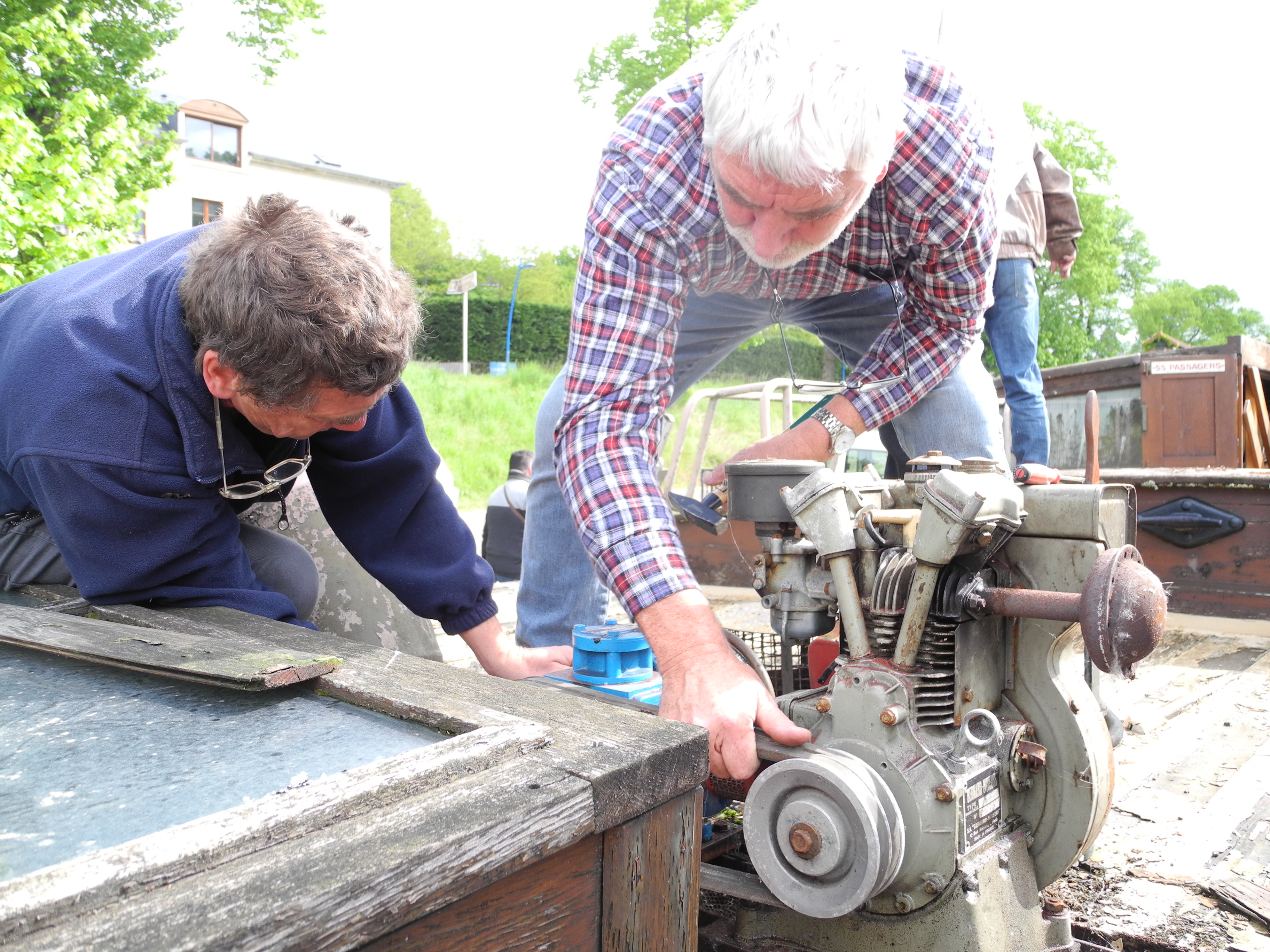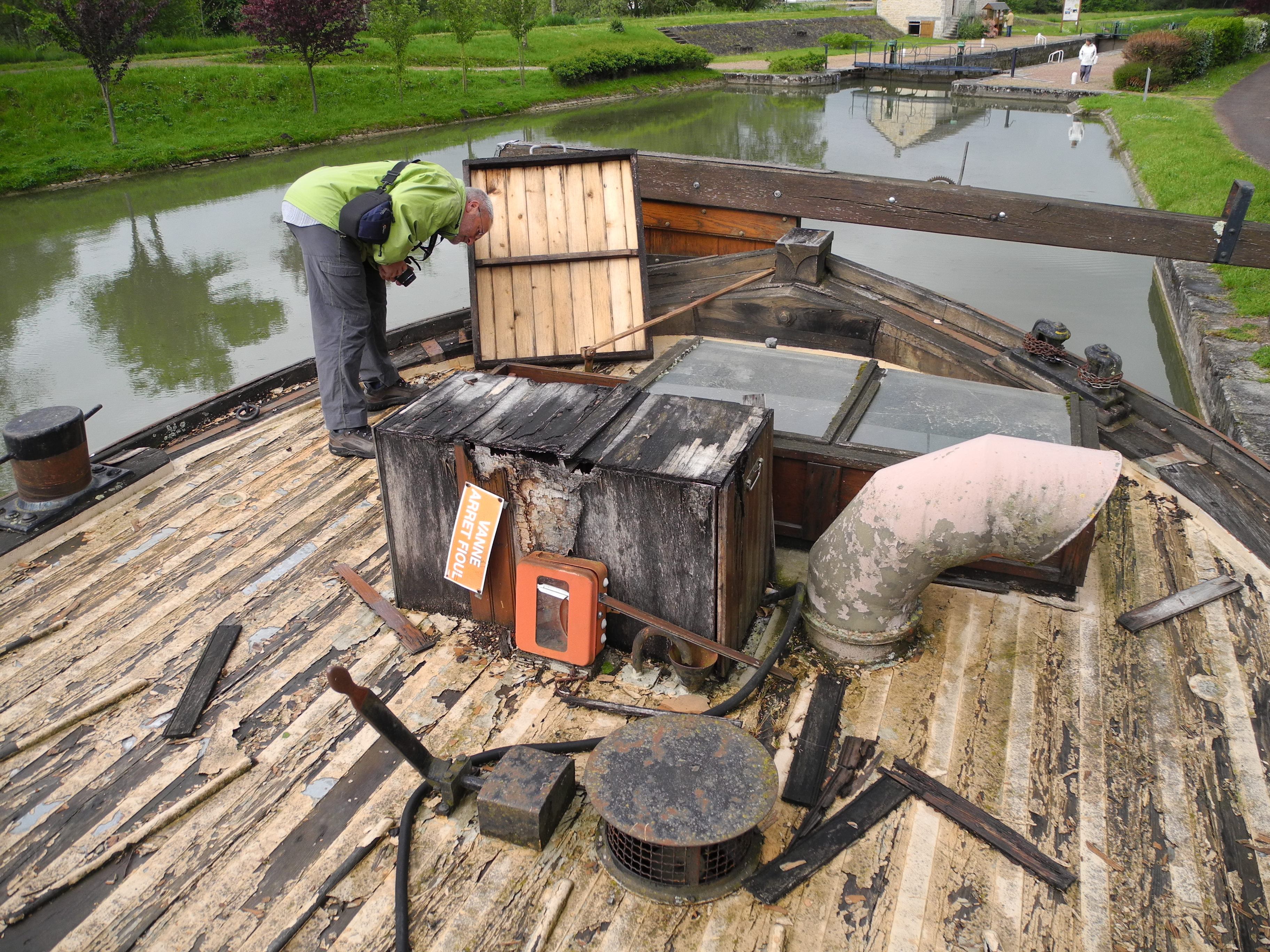 28th.  Early start this morning as part of a three car convoy heading for Decize on the Loire and the canal Nivernais  to view the last wooden barge to be built in France. Although it was only built in 1951 so is relatively speaking quite a young boat, not many of them survive. The ownership is passing from the local waterway trust to Aqua which is the association that includes the museum in St Jean de Losne.  The visit today was to see what needed to be done in order to move the boat to St Jean, about a six day trip. Once she is there it is envisaged that she will earn her keep as a venue for conferences, weddings, parties etc which will generate the money needed to keep her afloat and preserve this little piece of boating history. It was a nice drive through hillier country and vineyards.