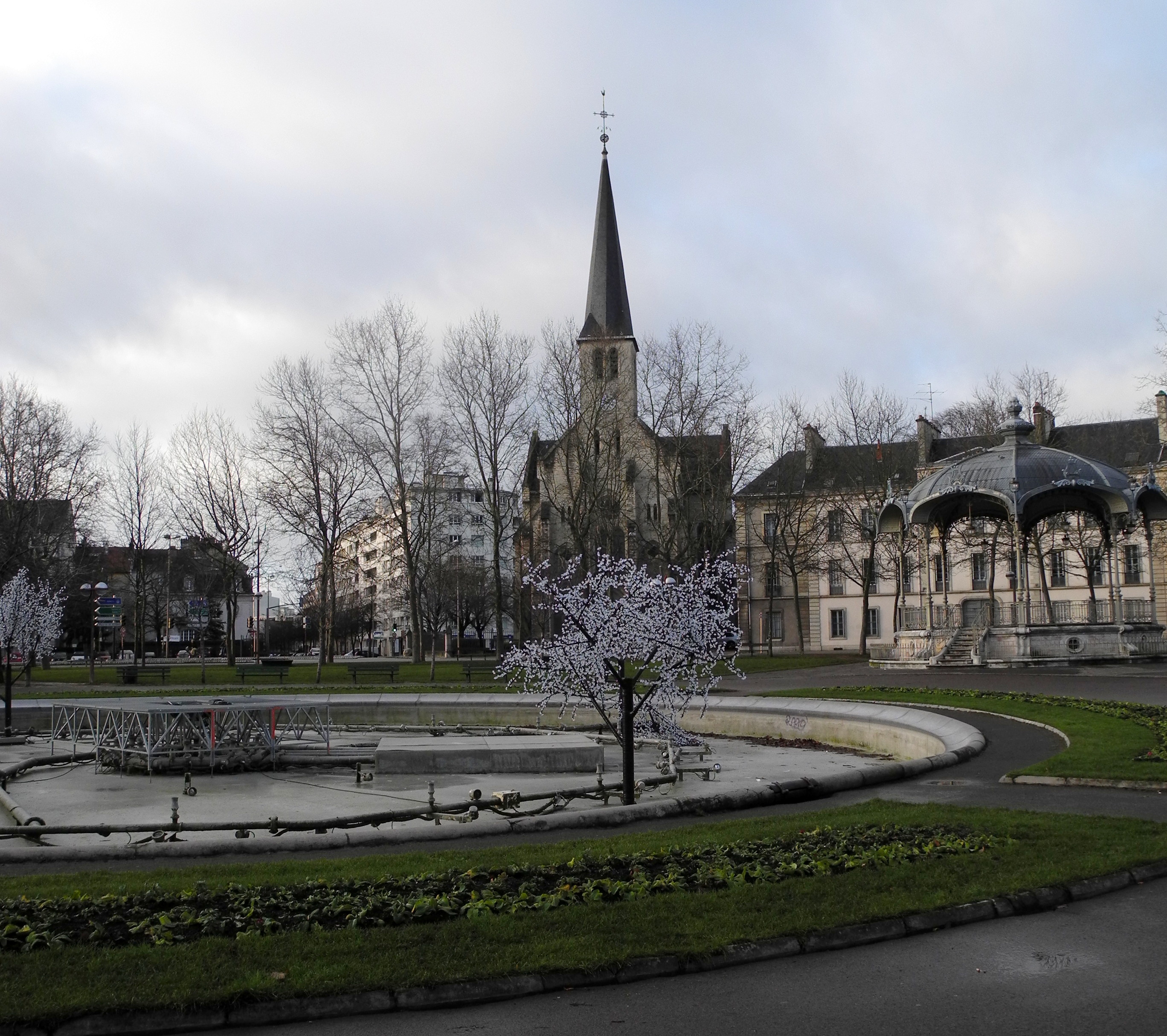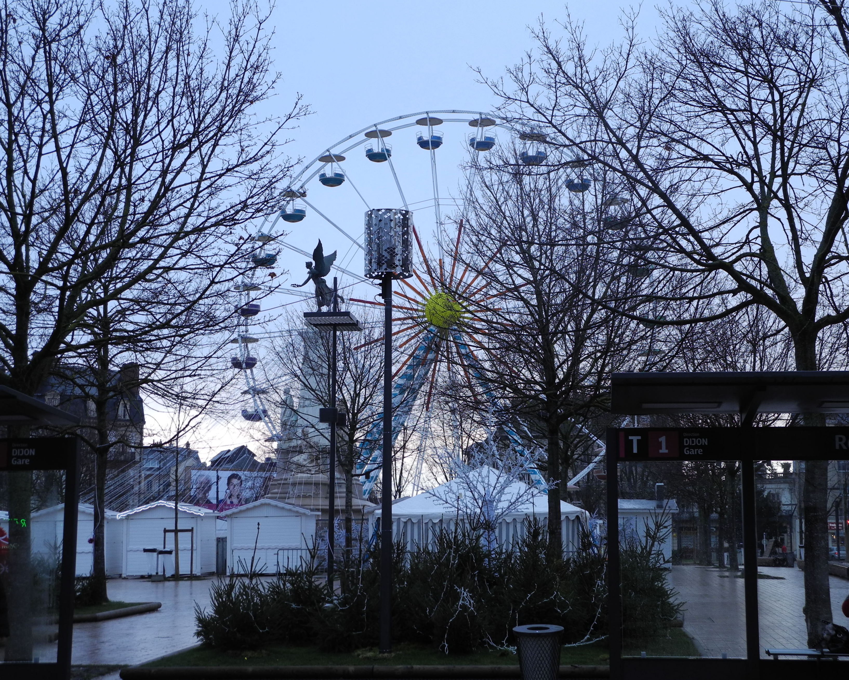 2nd January Armed with a City map and instructions from the hotel staff I took the tram to the Toison D’or shopping mall (pictured above – note the blue sky, the weather is pleasantly mild!) and bought an HP laptop, new “Office” program and computer bag. From there to the big Citroen dealership to look for a car. As luck would have it they had a demo model which although only two months old and with a paltry 1000k on the clock, is considered last years model. It is also an automatic, which given current and potential knee problems, is a bonus. It is available by next week and at a good price. Deal done the salesman drove me back to my hotel and has undertaken to pick me and my luggage up when the car is ready for collection. Vive La France! The main transport hub for trams and buses is the Place de la Republique which is currently occupied by the Christmas Fair. Seen in the early morning light with its bare trees it is quite attractive.
