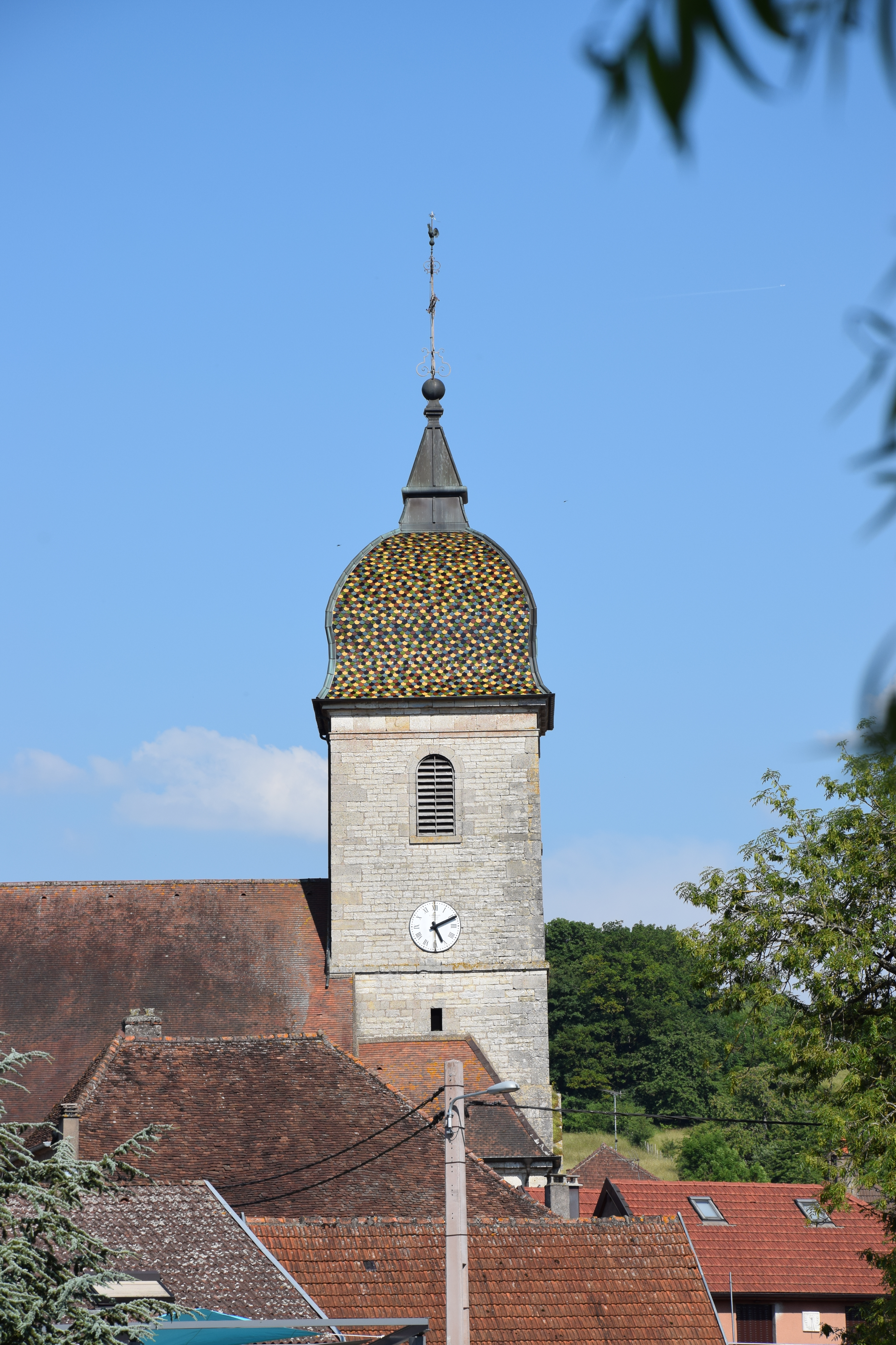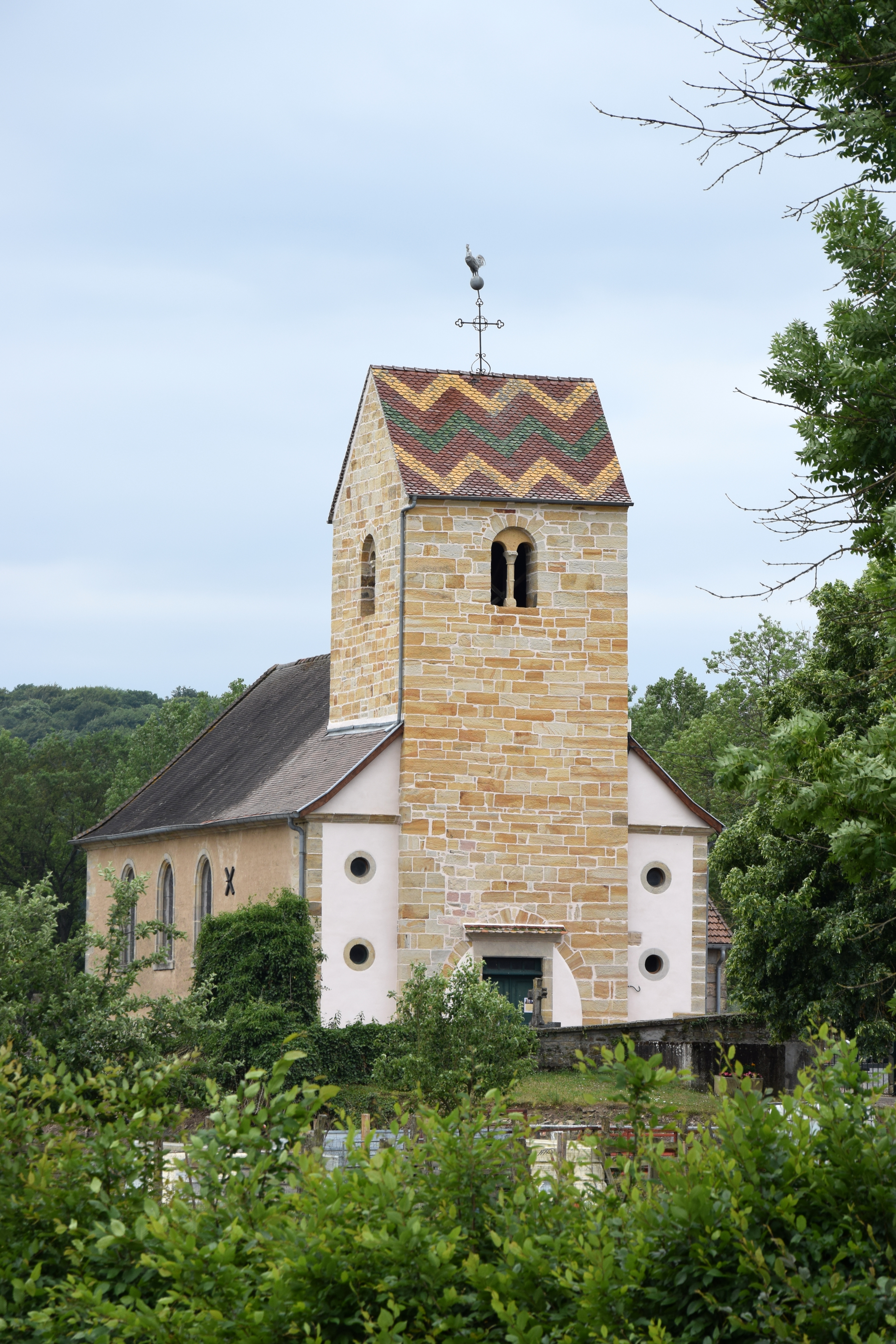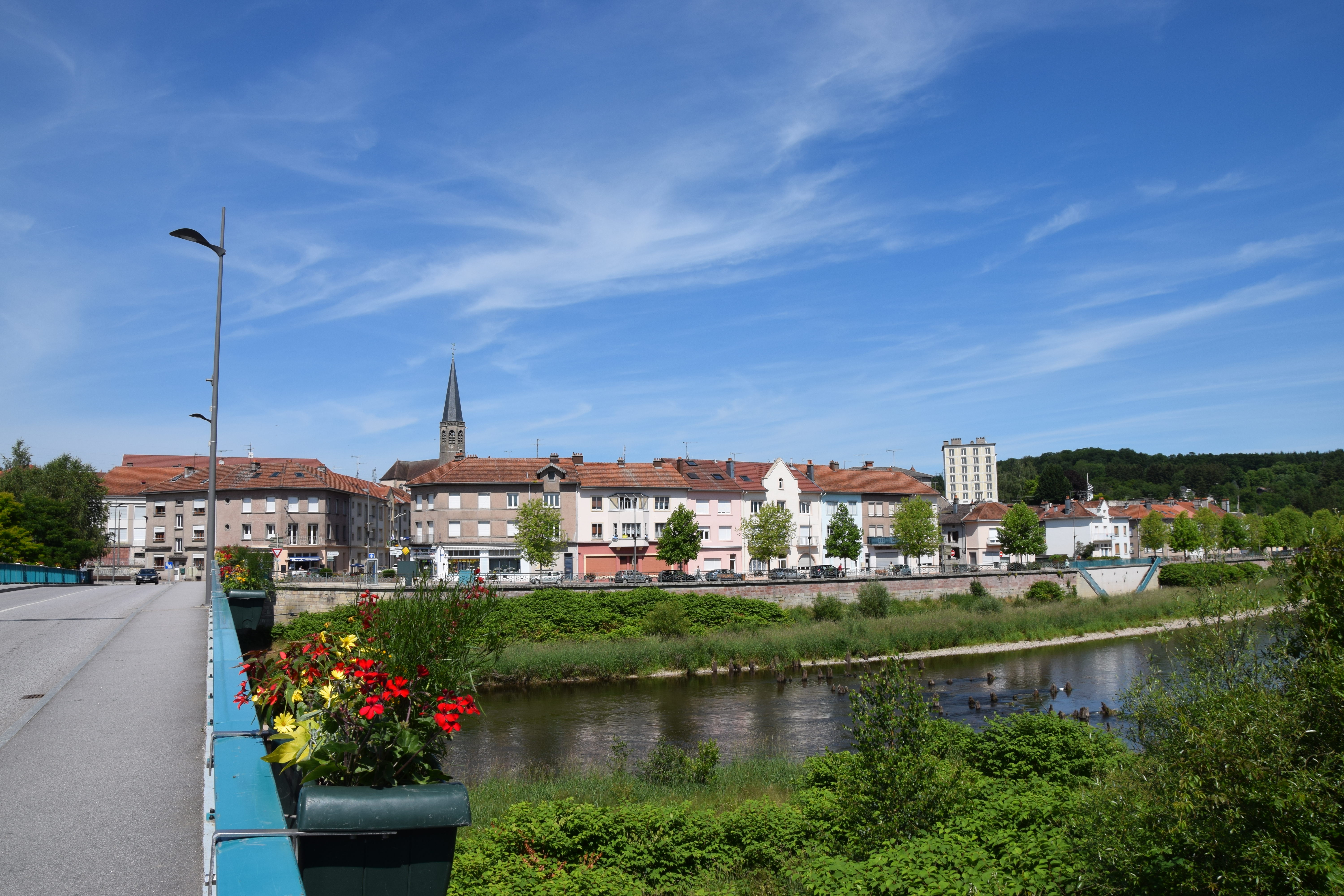 19th June 2015. 72nd birthday! Finger and foot tapping my way down the canal de Vosges to Gilbert O’Sullivan’s quirky rocking jazz & quirkier lyrics or singing along at the top of my voice to Carley Simon – showing my age and not giving a toss- it is difficult to imagine a better way to celebrate. Rhian, who was off on the bike for this stretch, met me at one of the locks with a packet from the patiserie and a birthday wish. we are moored up outside the village of Bayon which is claimed to have a good place to eat so we will put on our glad-rags later and test its reputation. A cycle ride into Bayon earlier revealed a couple of interesting buildings and an elegant church tower.