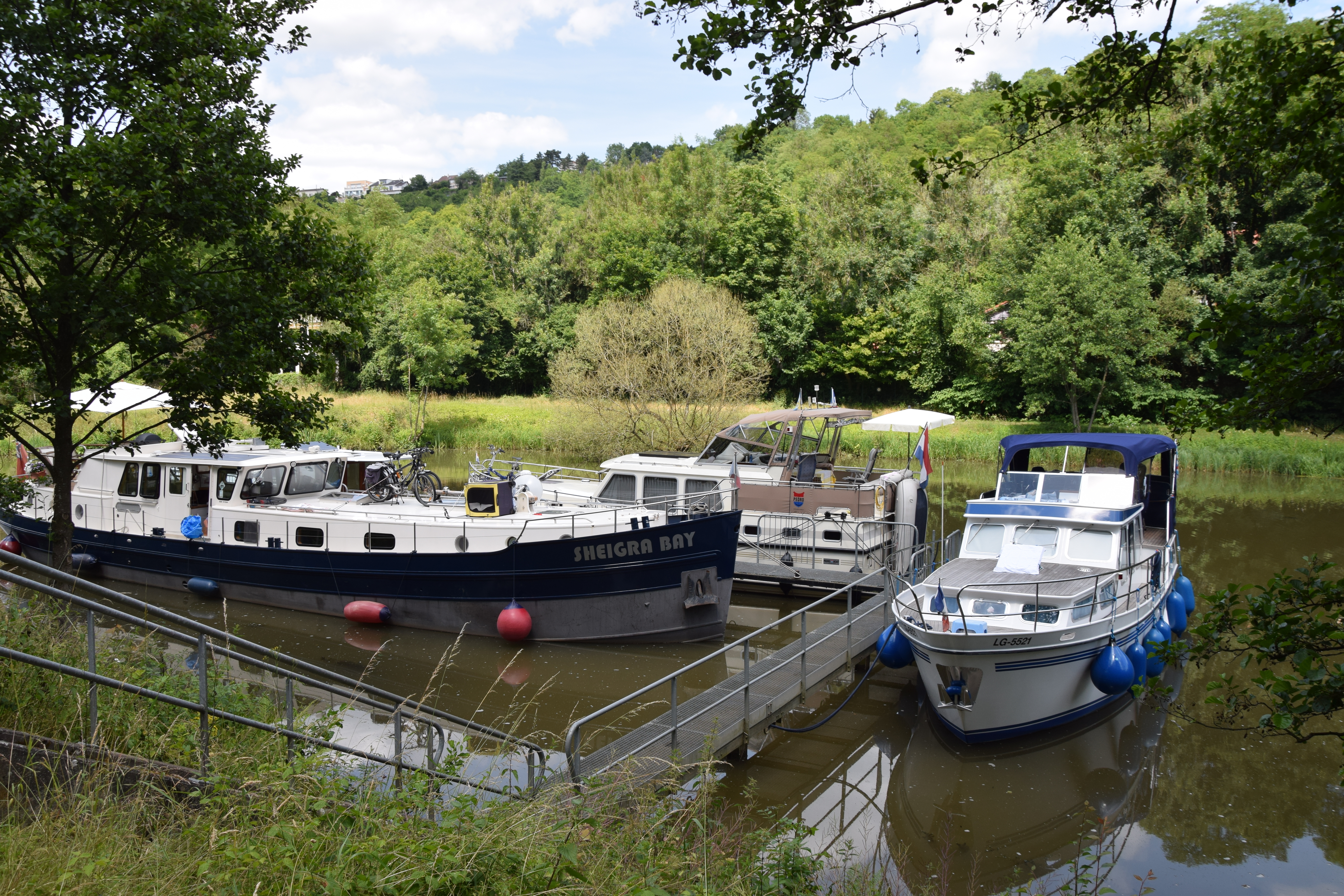 25th Cruised to Liverdun. The mooring among trees in a little branch off ther main river was delightful and we were helped onto the small pontoon by other boaters. There is not a lot of space. The fortified village up on the hill was interesting and we enjoyed exploring before returning to our tranquil mooring.