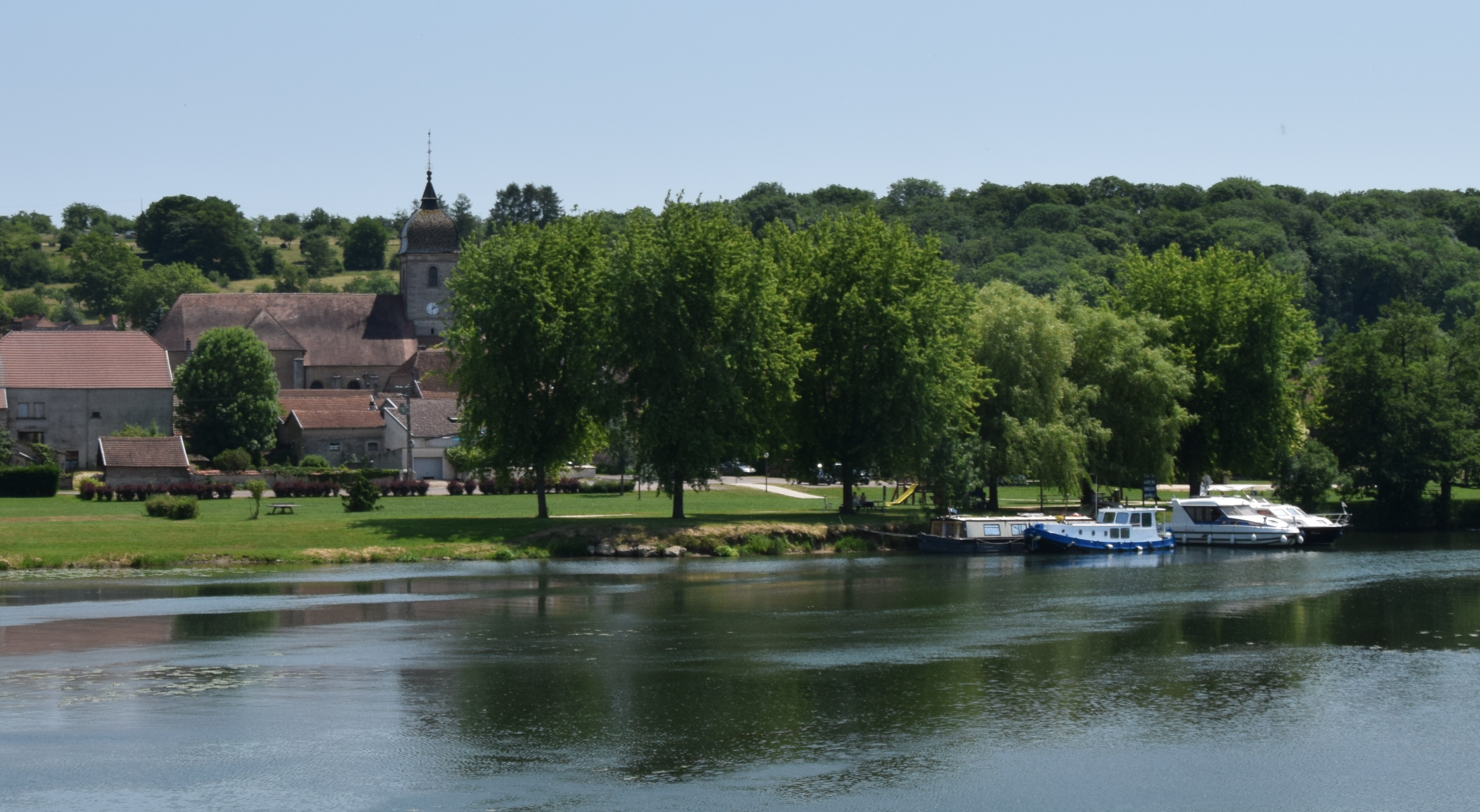 We  cruised on to Gray and moored up on the other side of the weir, it is quieter here than in town.  We saw Peter from St Jean on his boat as we went through town so once we were moored up we cycled over to see him and had tea. This month’s banner photo was taken of the town bridge and weir was taken from the deck of the boat. The water coming over the weir is used to generate electricity.