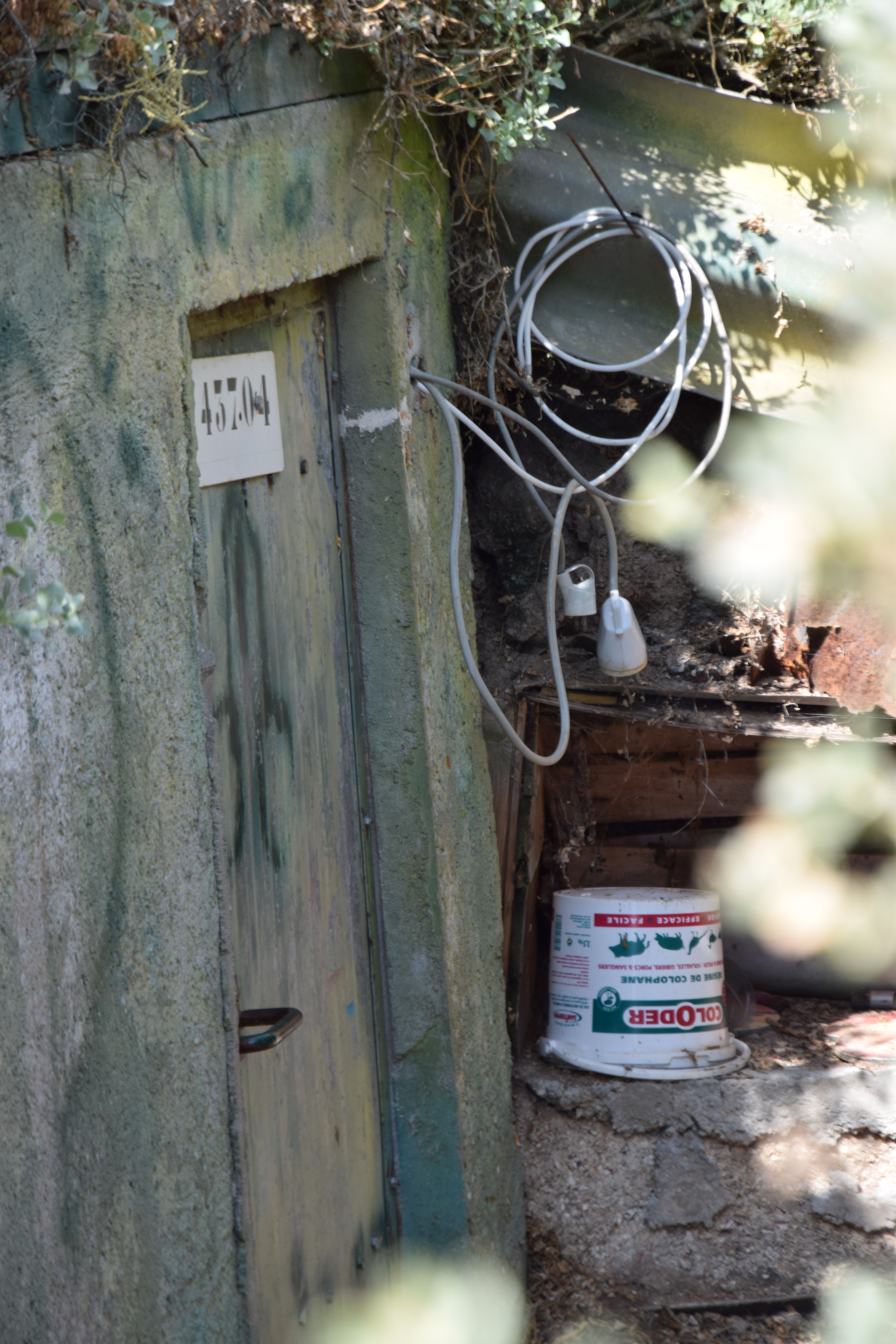 From there I decided to explore a cycle path along a drainage canal that I had previously noted in passing. I came across something that I thought must be a bird hide by some open water, with unidentified waterfowl bobbing on the surface, but which on closer inspection I thought might be an old military installation due to the stenciled numbers on the locked door (with facilities!)