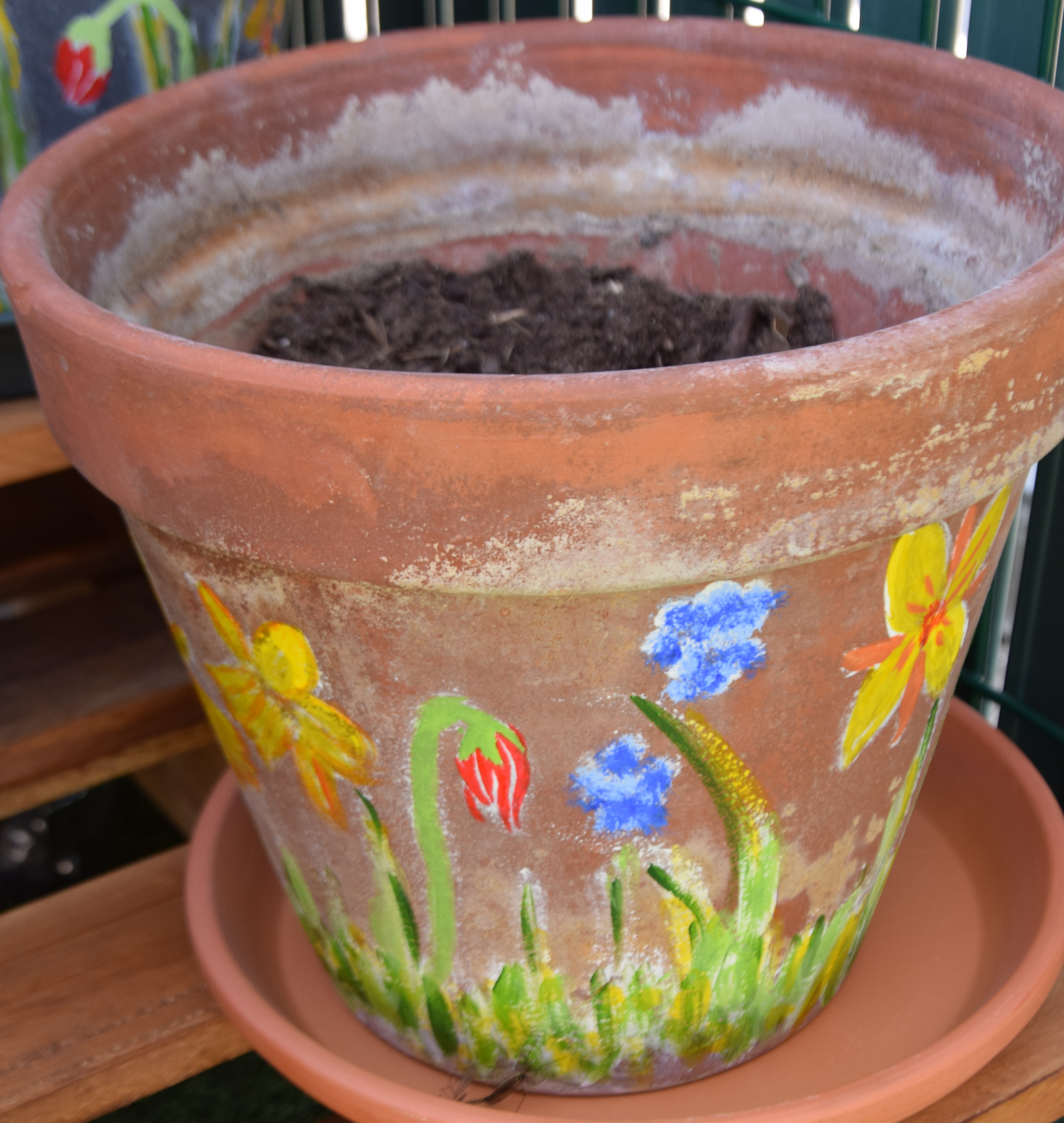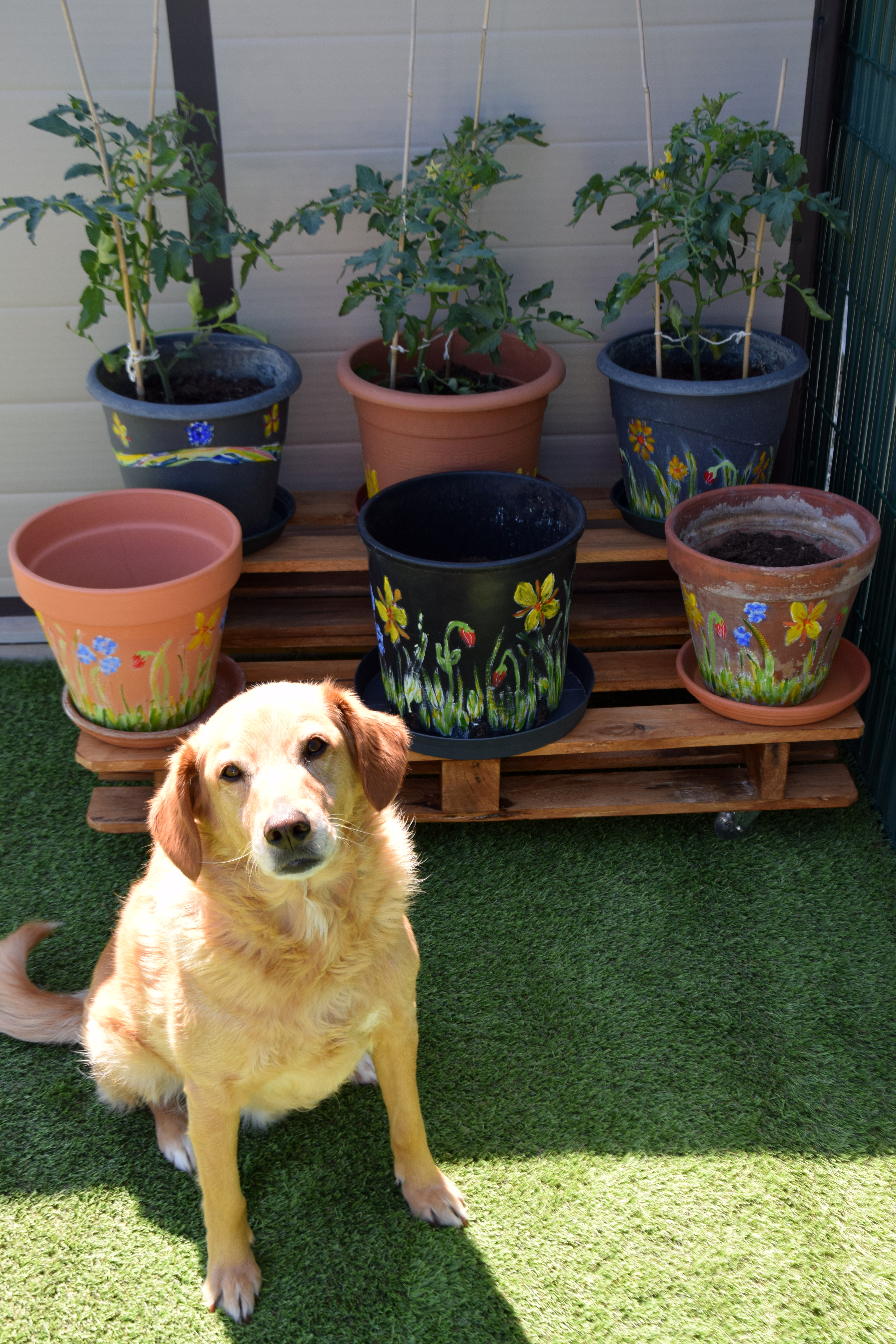 22nd Work started on the garden with re-sealing of all the wooden planters and supports and decorating otherwise rather boring plant pots. Cassidy was keen to get in on the act!