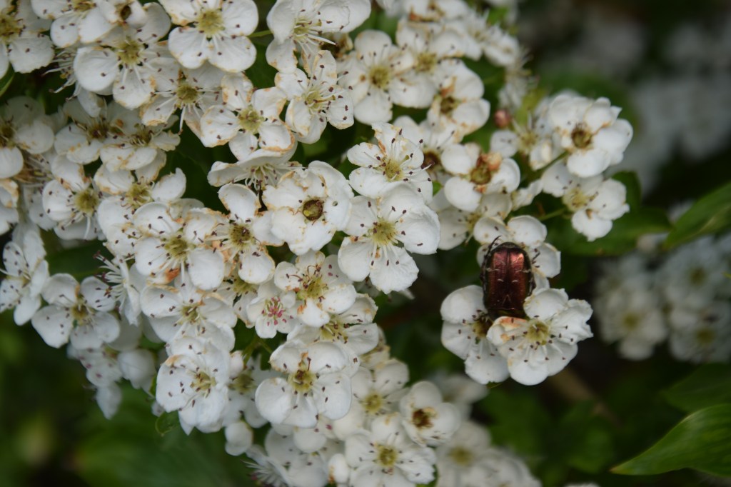 30th Early morning walk revealed that the Hawthorn (or May) was out. These blossoms have a colouful scarab visiting them. Now according to the Olde English saying – “Ne’er shed a clout till May is out” we can now discard our winter cloths.