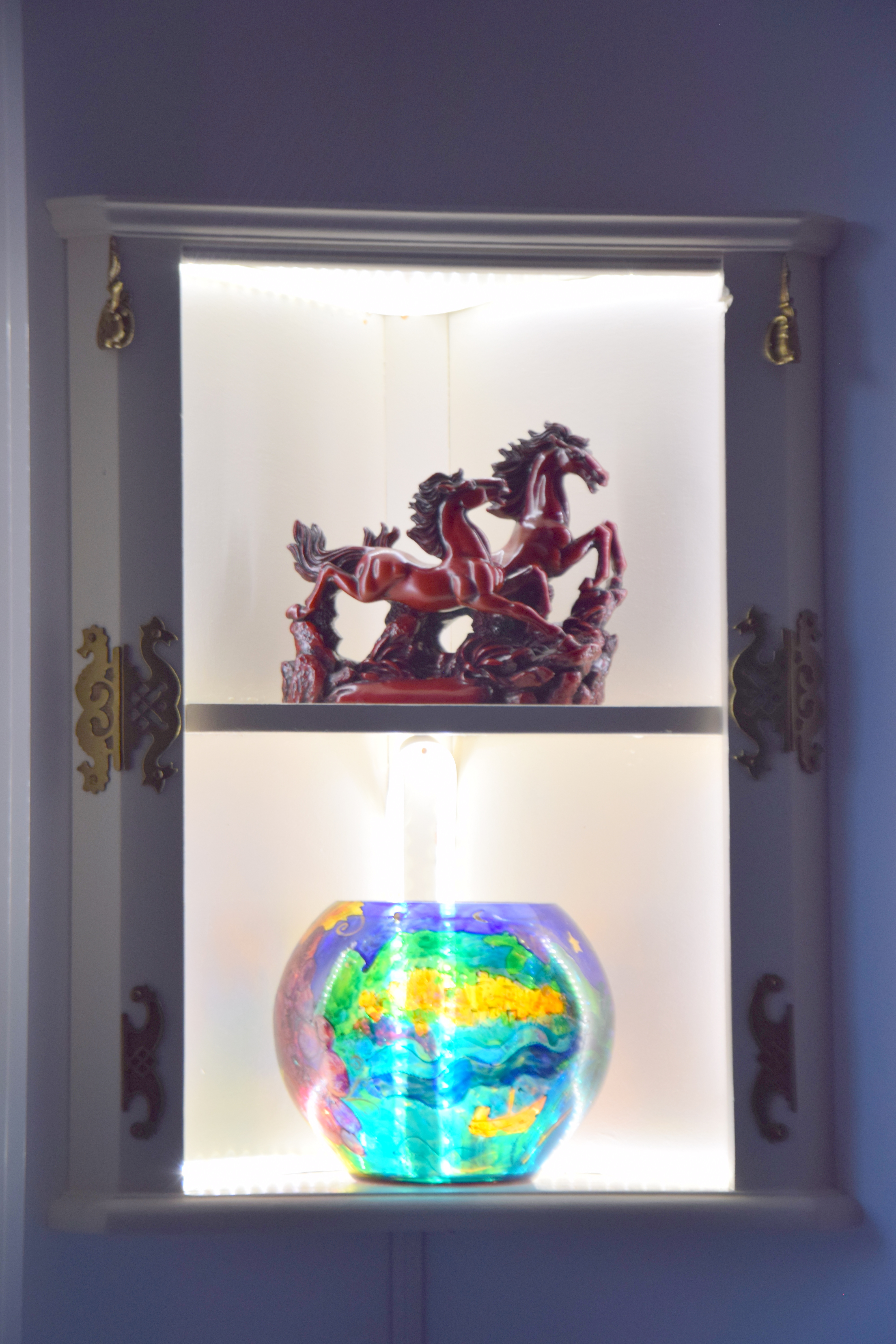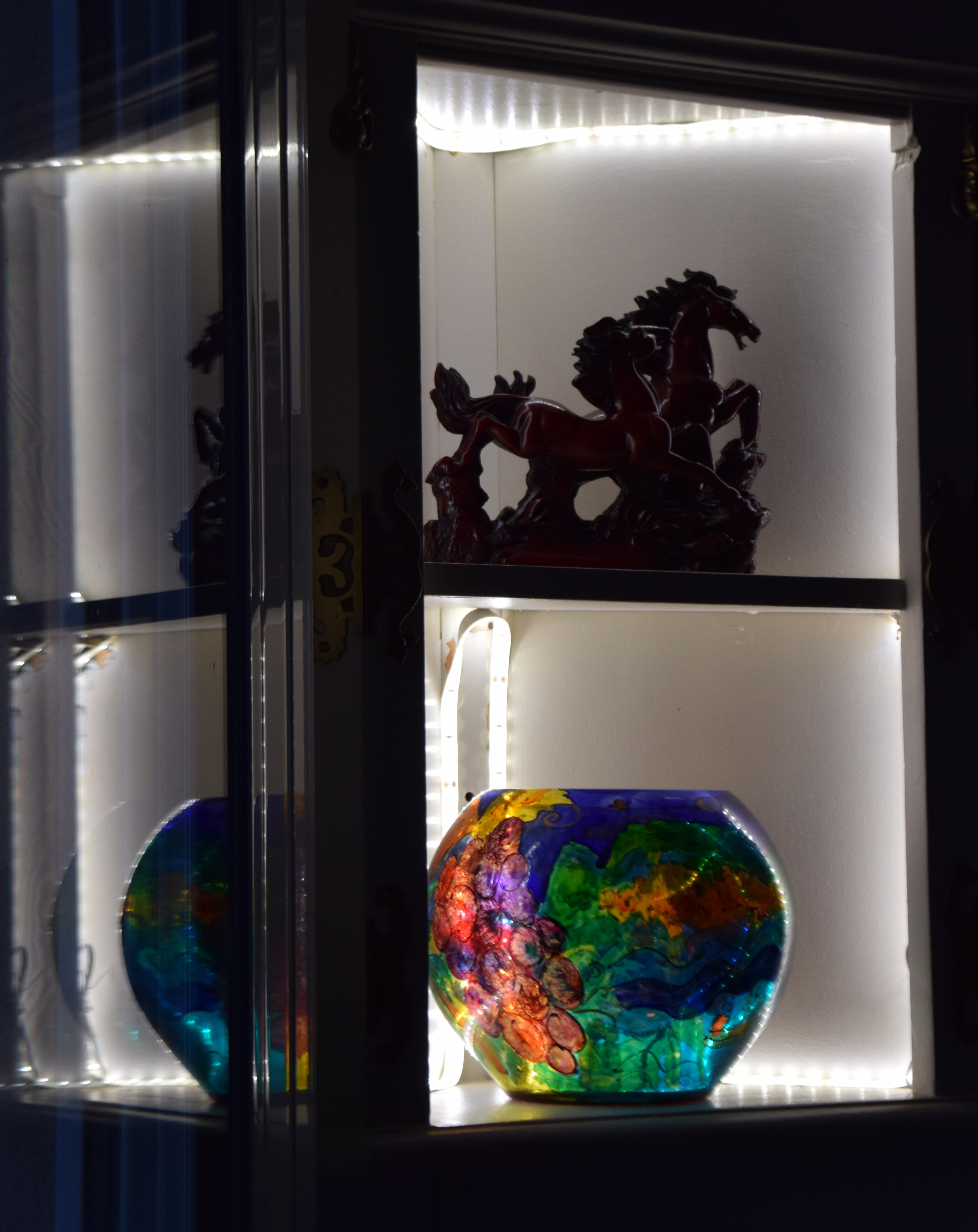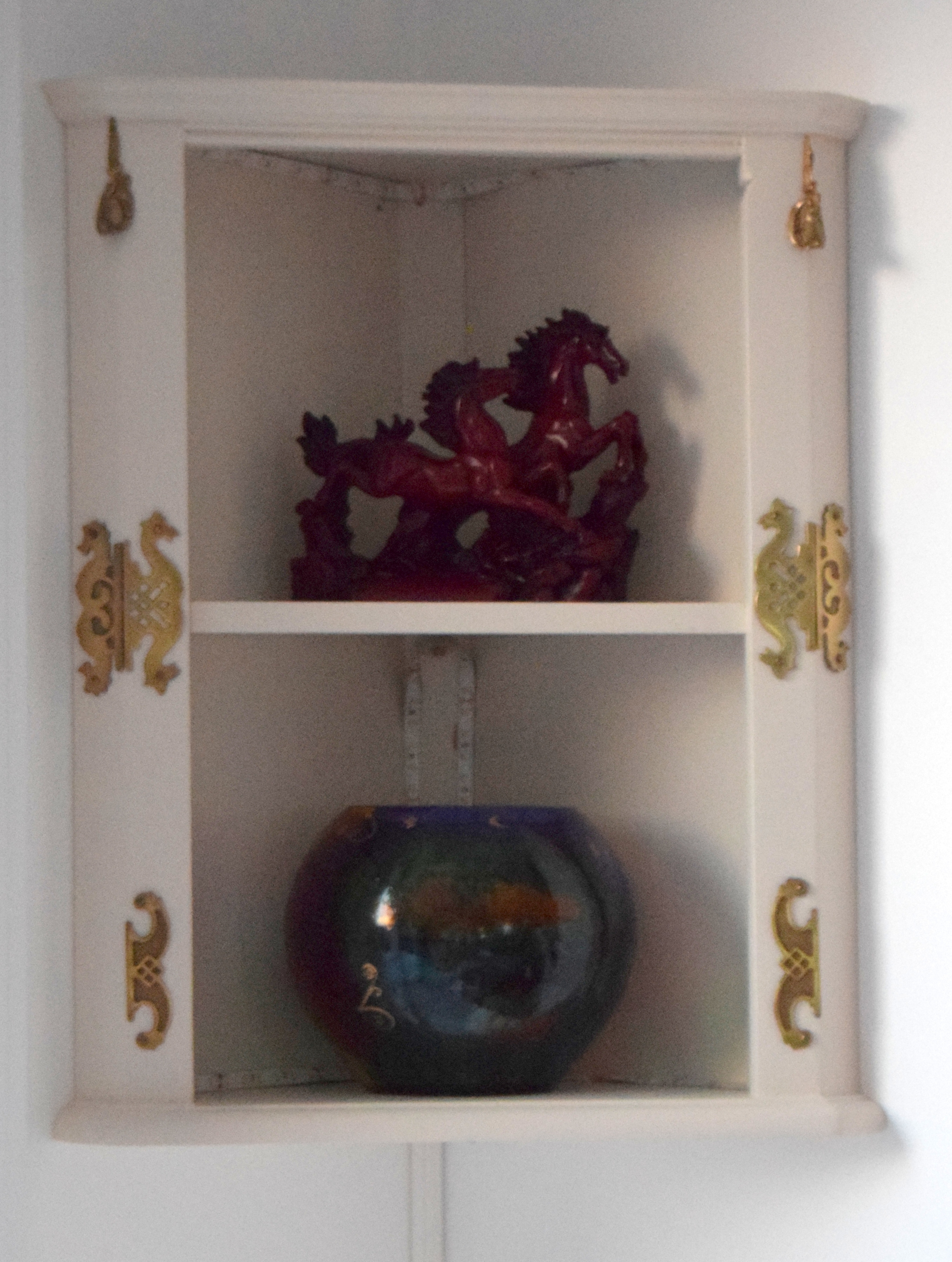 15th Over the last two days I have worked on refurbishing the small corner cupboard. Covering the old back and red paint with the same off white as the dining furniture, re-mounting the brass and adding new pieces and adding strip LED lighting.
