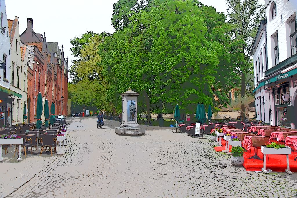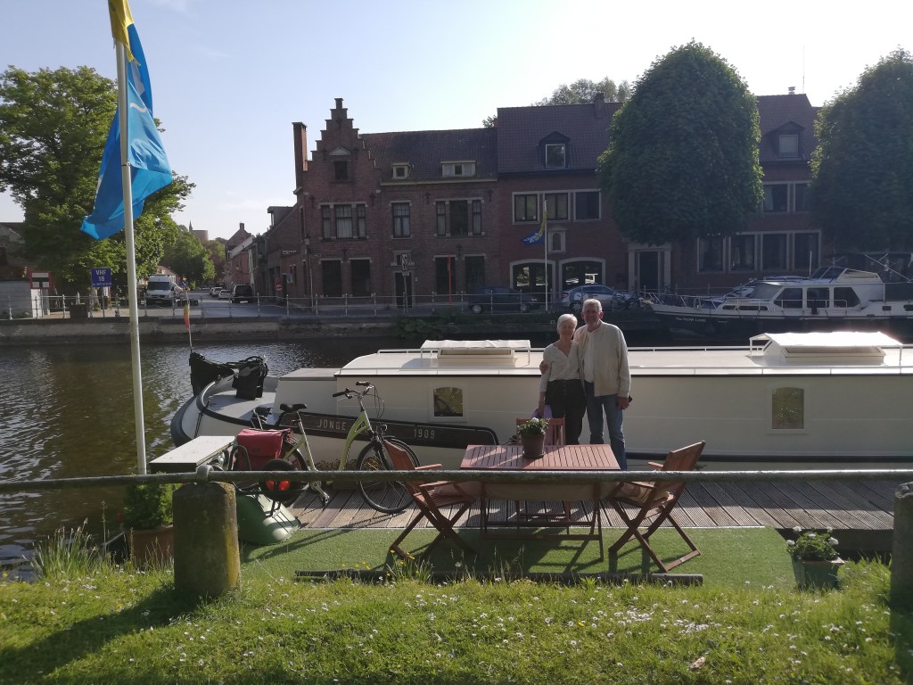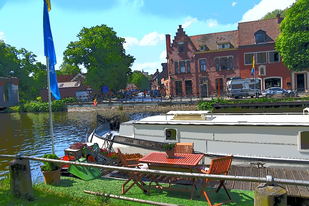 I had chosen the road less travelled so expexted the 80k drive to take about 2 hours as I was expecting open countryside and photo-opps. No such luck. Largely suburban sprawl with village after villagee and speeps frequently down to 30kph. However as we got closer to Brugge the traffic became intense with multiple tail backs and slow stop/start driving. The drive ended uo taking 5 hours and when I got to the Aire it was full so I had no option but to park in the adjascent bus park at Euro 55 pn. Found helen and Steve who rescued me from my exhaution with rosé and wild prawn rissoto. Lovely to see them, great meal and wonderful company.