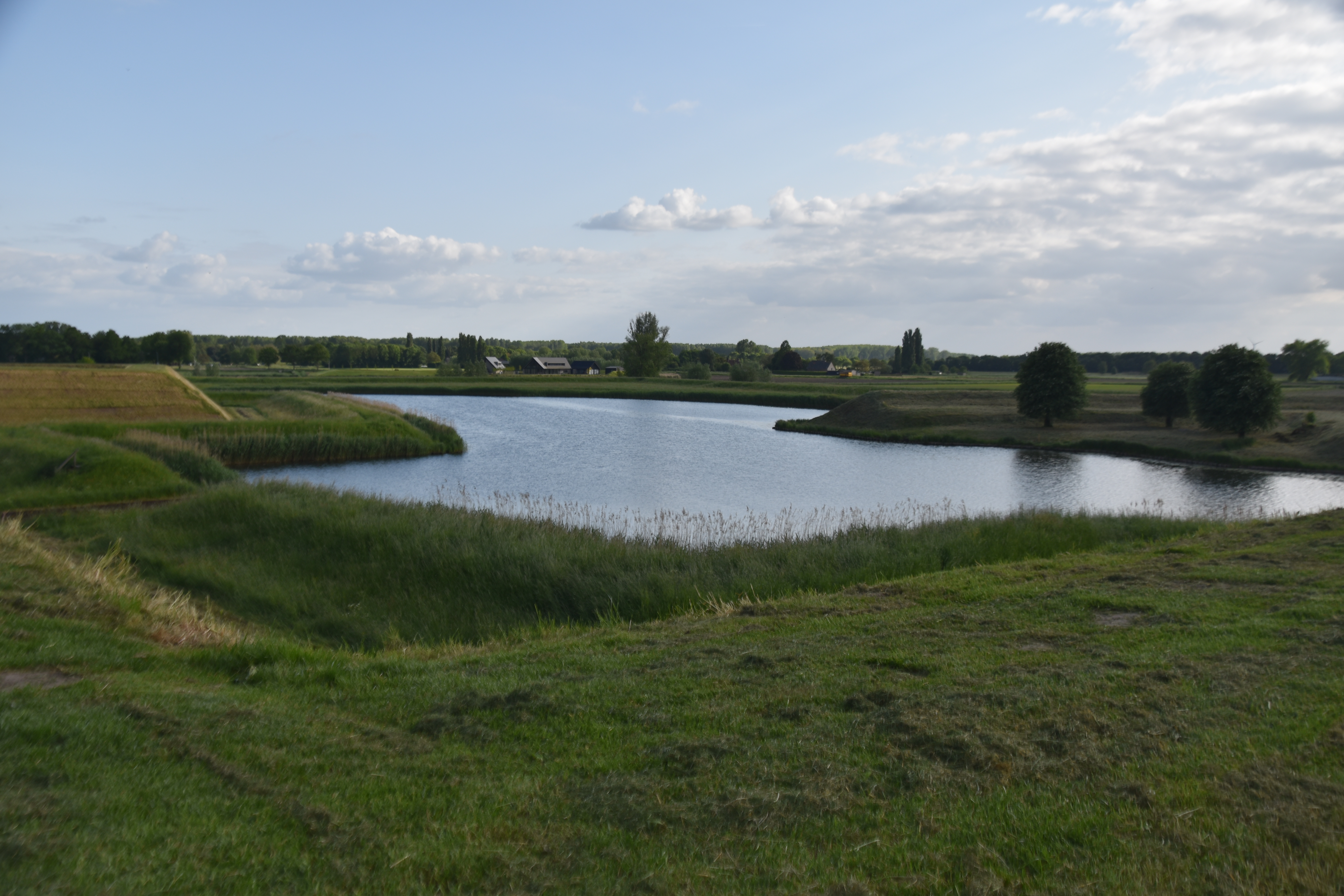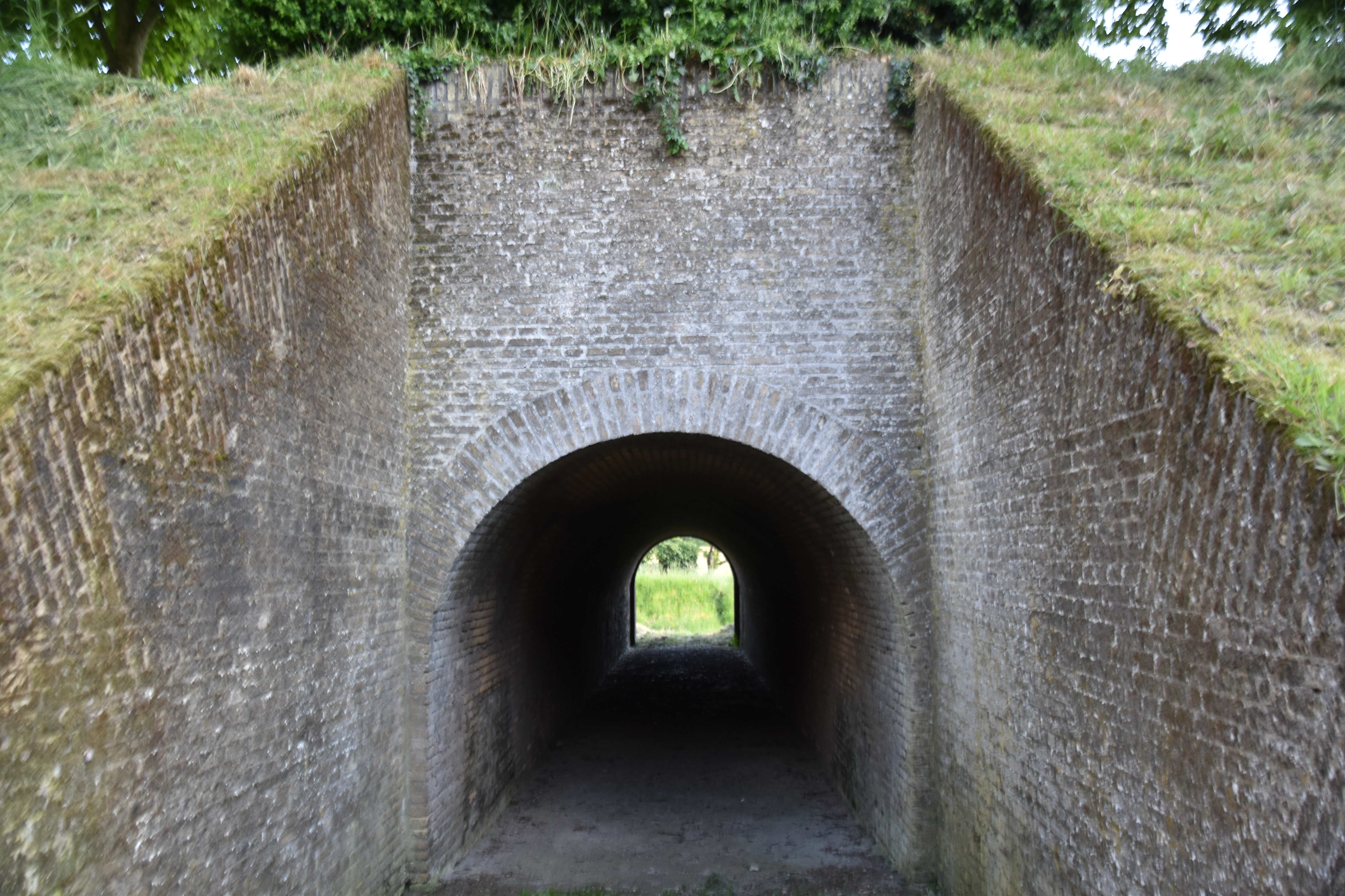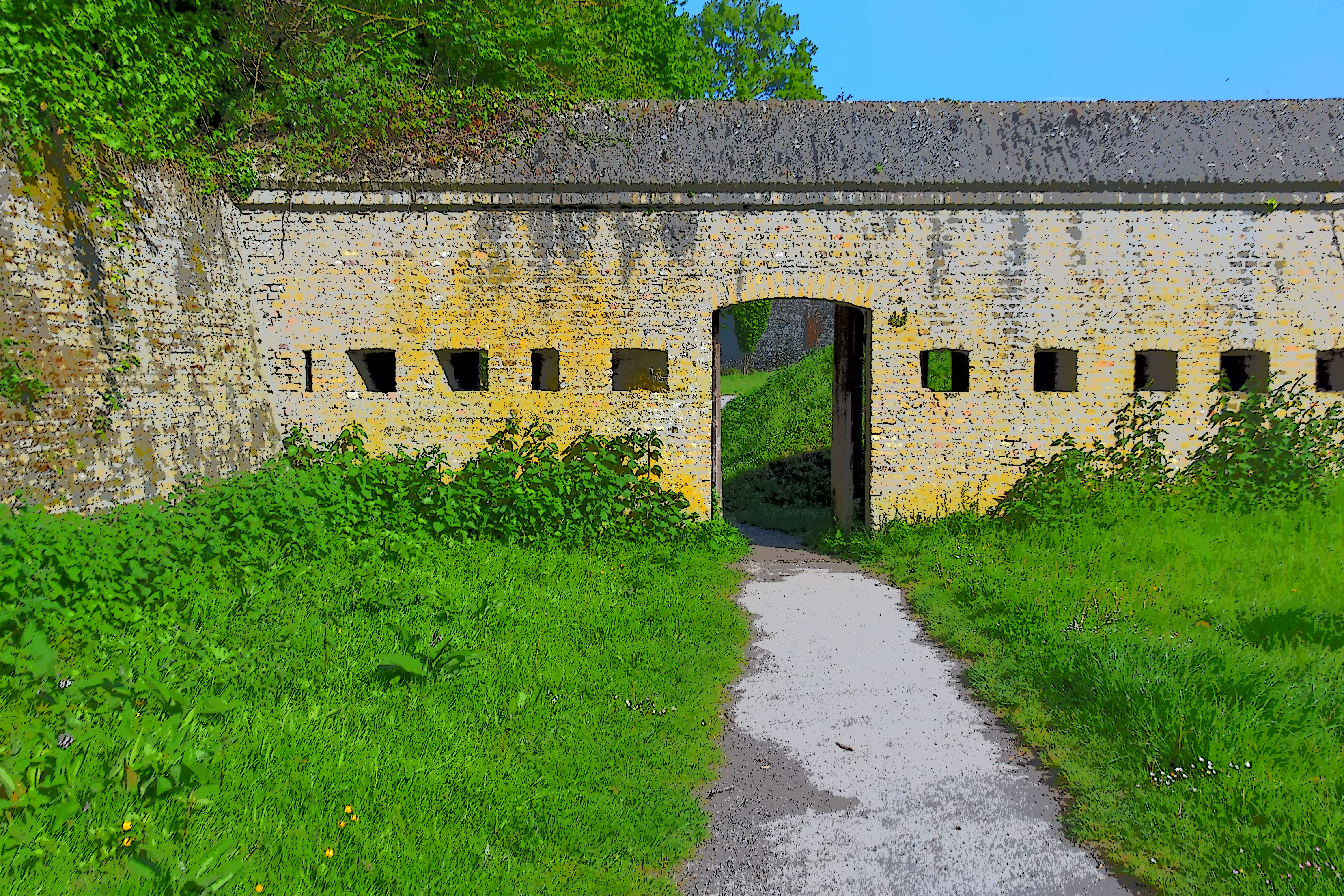 There is not much evidence left of the walled city appart from the barely discernible star point with canon mounted and the powder magazine set in a protective earth burm which might or might not be another star point.