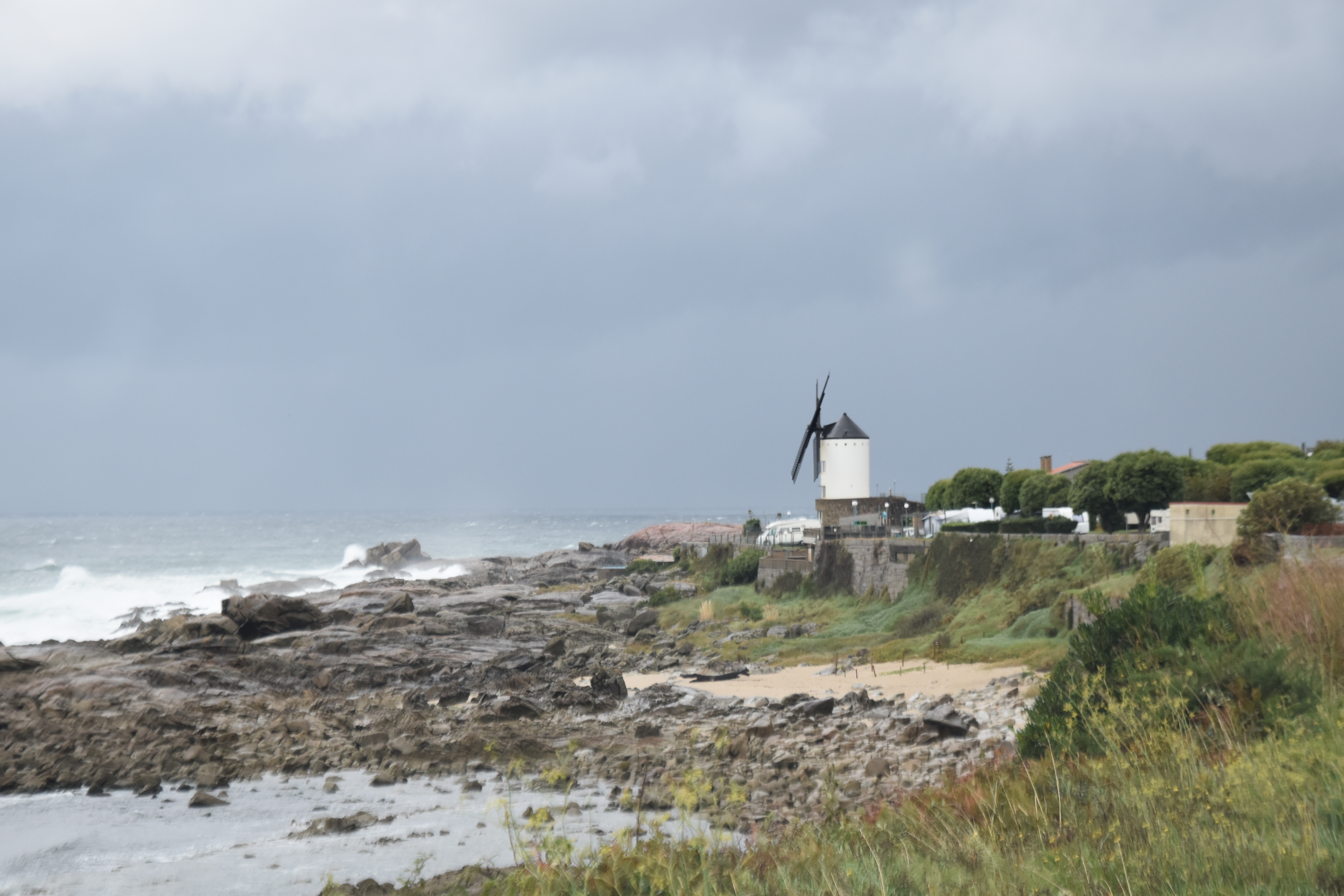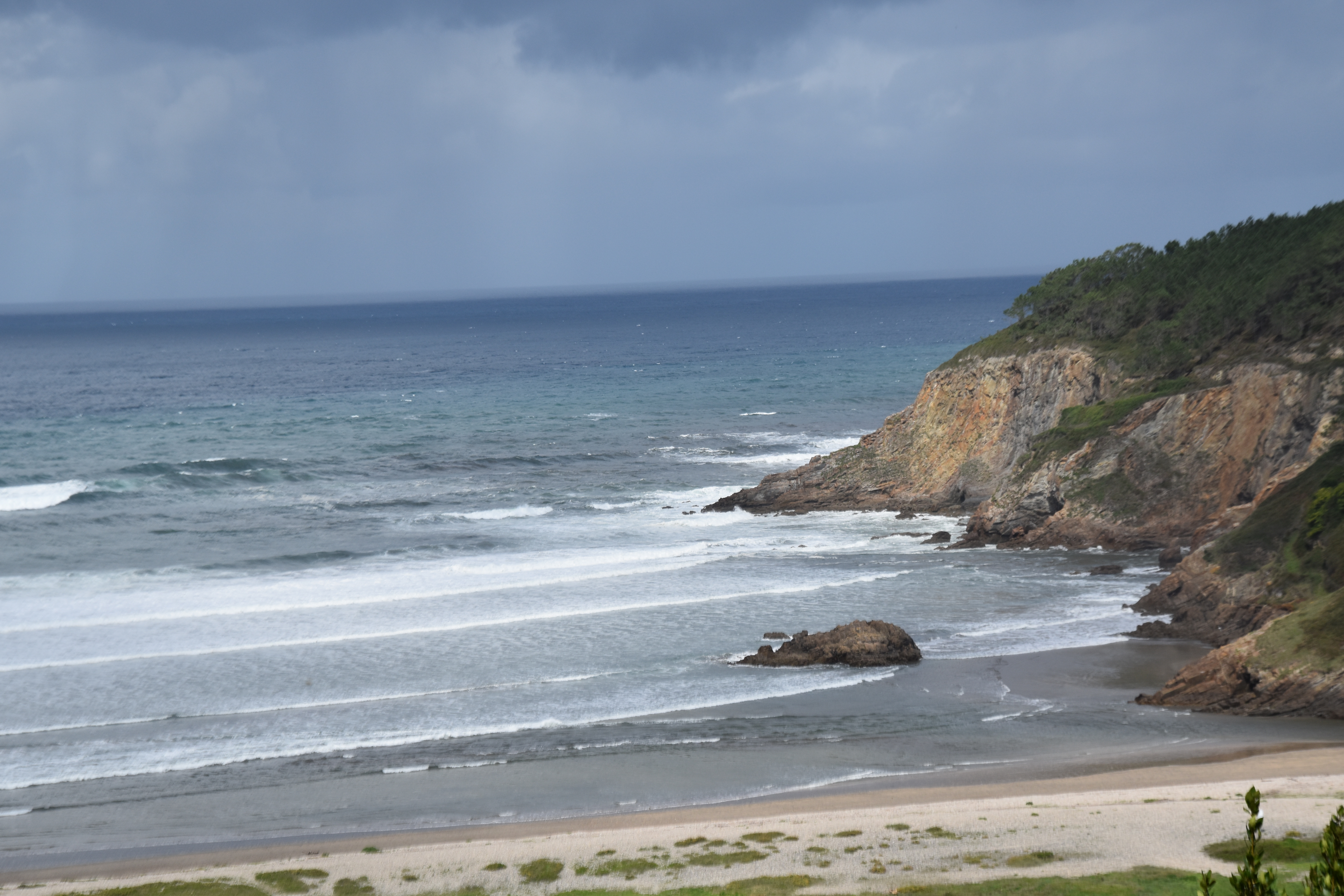 21st A blustery old day with squalls moving in from the Atlantic with very short clear spells in between. Once I got out of A Coruna, which proved a bit of a mission, the coastal route just got better and better.The same rolling hills and gently winding roads but more sea scapes, beaches, small ports and villages, all in all a delight. The bad weather really meant that being inside the vehicle was the best place to be. That being the case I might as well be driving. I did make a few futile atempts to find a solution to my gas problem but since the French and Spanish bottles and fittings are not compatible I have decided to manage without. Stoped for an excellent coffee at Santa Cruz just outside A Coruna and had a late lunch at Origueira.