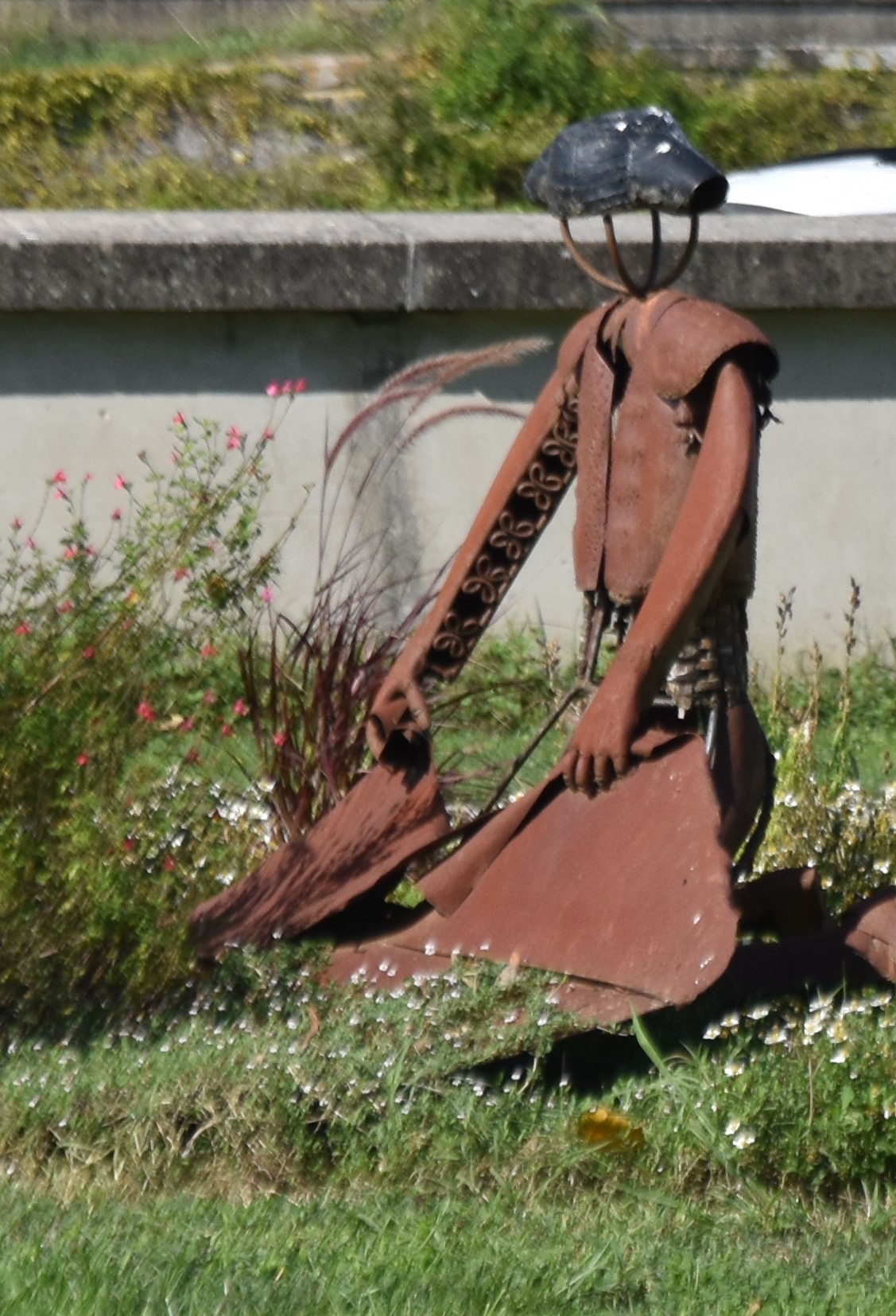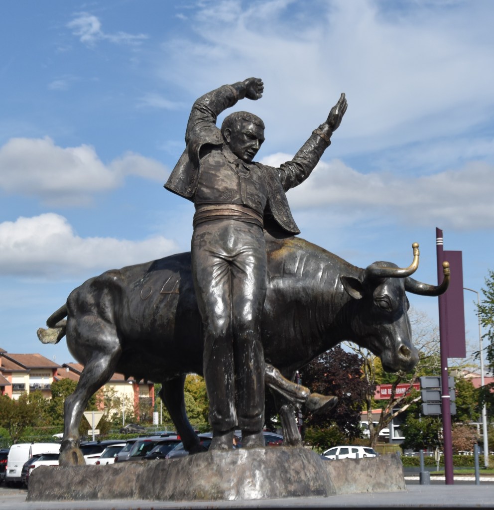 They also practice the less bloody version of the sport both here and in Mont -de-Marsan ( known as the bullfighting mecca ) called course landaise where the object is to vault over the back and horns of a cow. You can see the more realistic size comparrason between man and beast in the sculpture below and note also the protective covers on the cows horns.