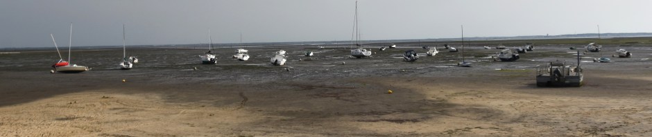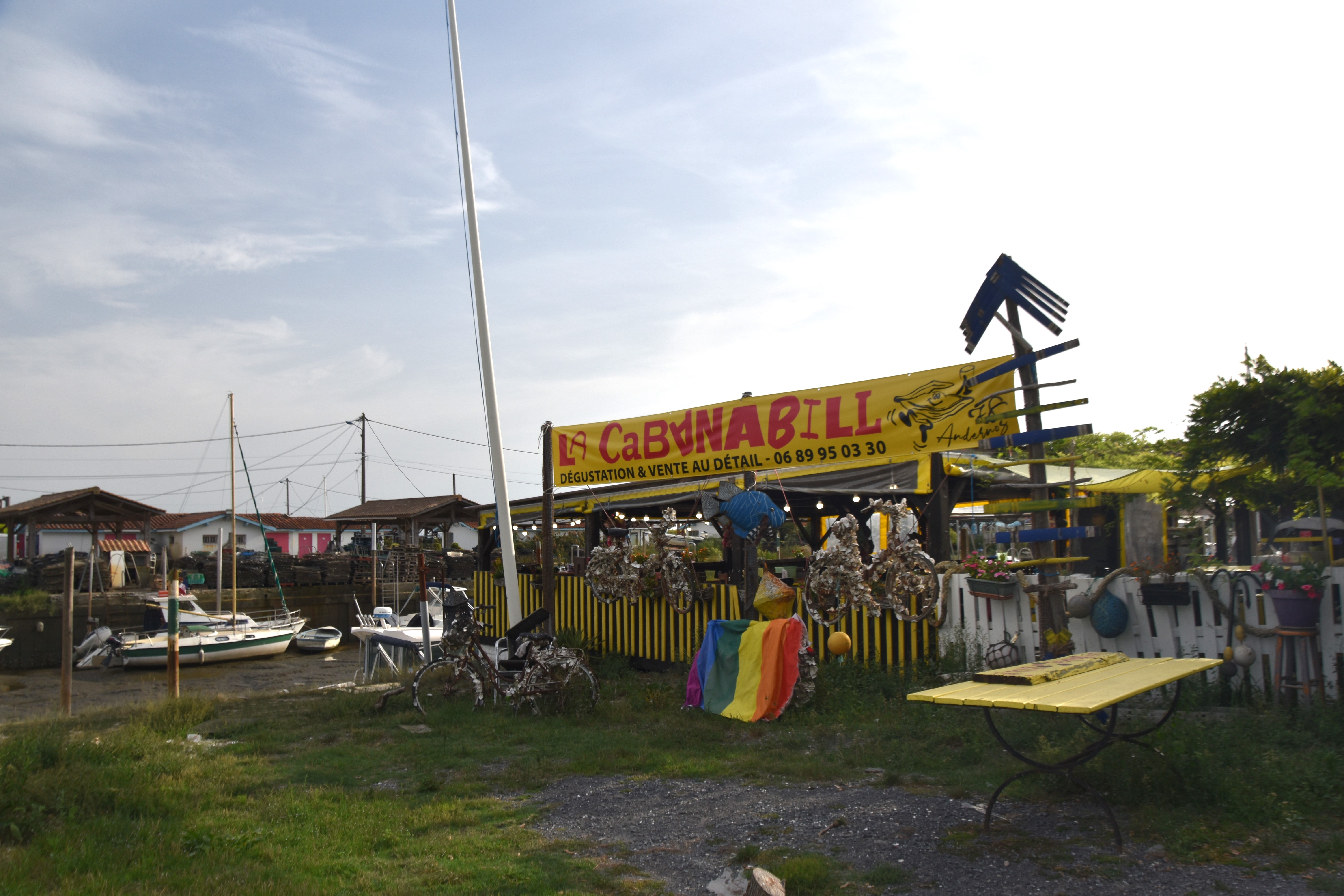 Got up the courage to leave the shade of the pine trees in the very late afternoon. There are five channels cut ibto thre town area with seven quais alongside. These support 76 individual Oysterculture businesses, many of them with tasting facilities of various levels of grandure or querkyness. One Quai is dedicated to Restaraunts where the same adjectives can be applied and the level of prices varies accordingly. The tide was out leaving just vestiges of water in the muddy channels and on the bay itself vessels were high and dry.