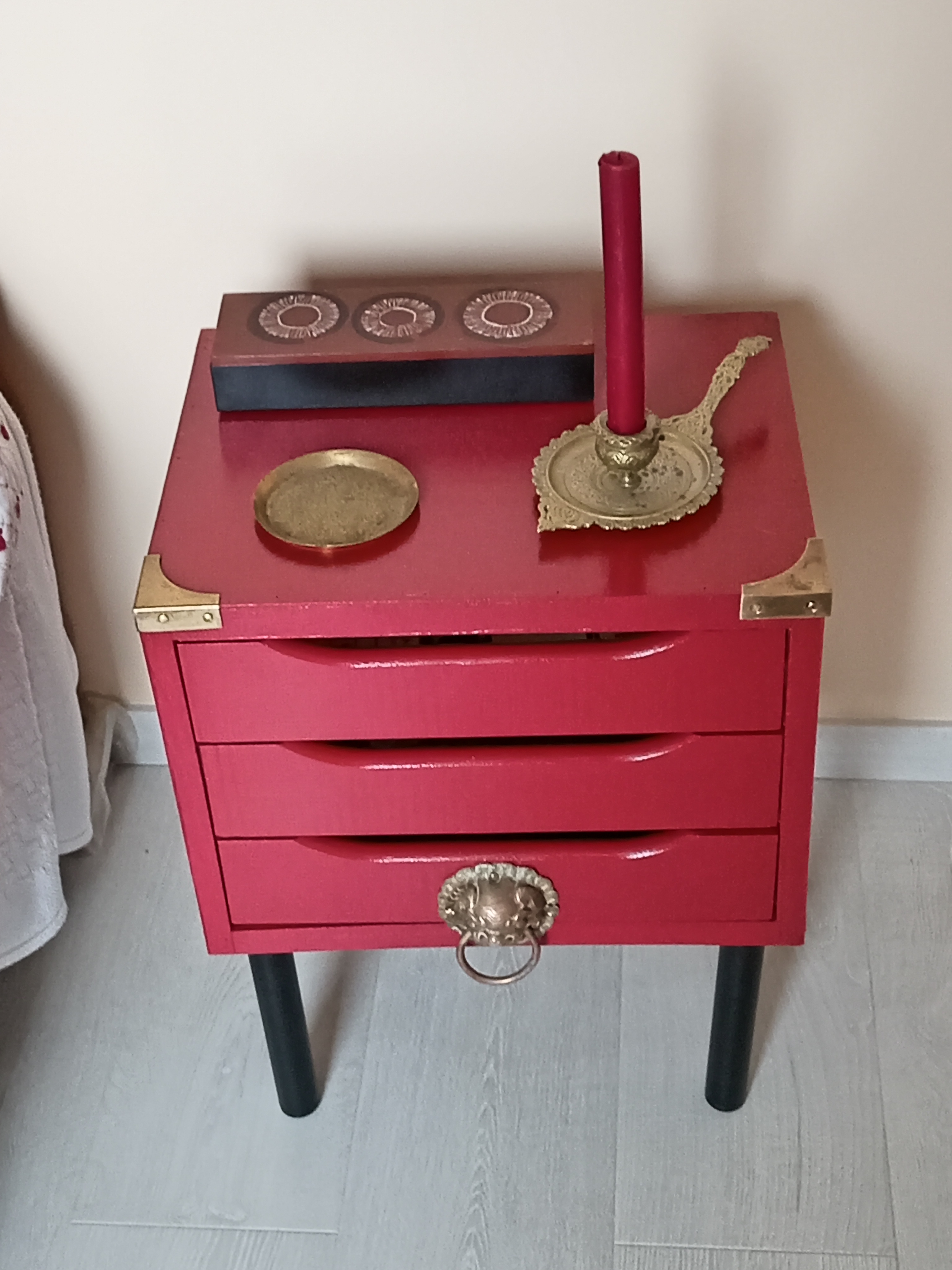 On the stormy days some small DIY furniture making projects. A bedside table to accomodate the new layout in the bedroom and the lack of some where to put your glass from one side of the sofa!