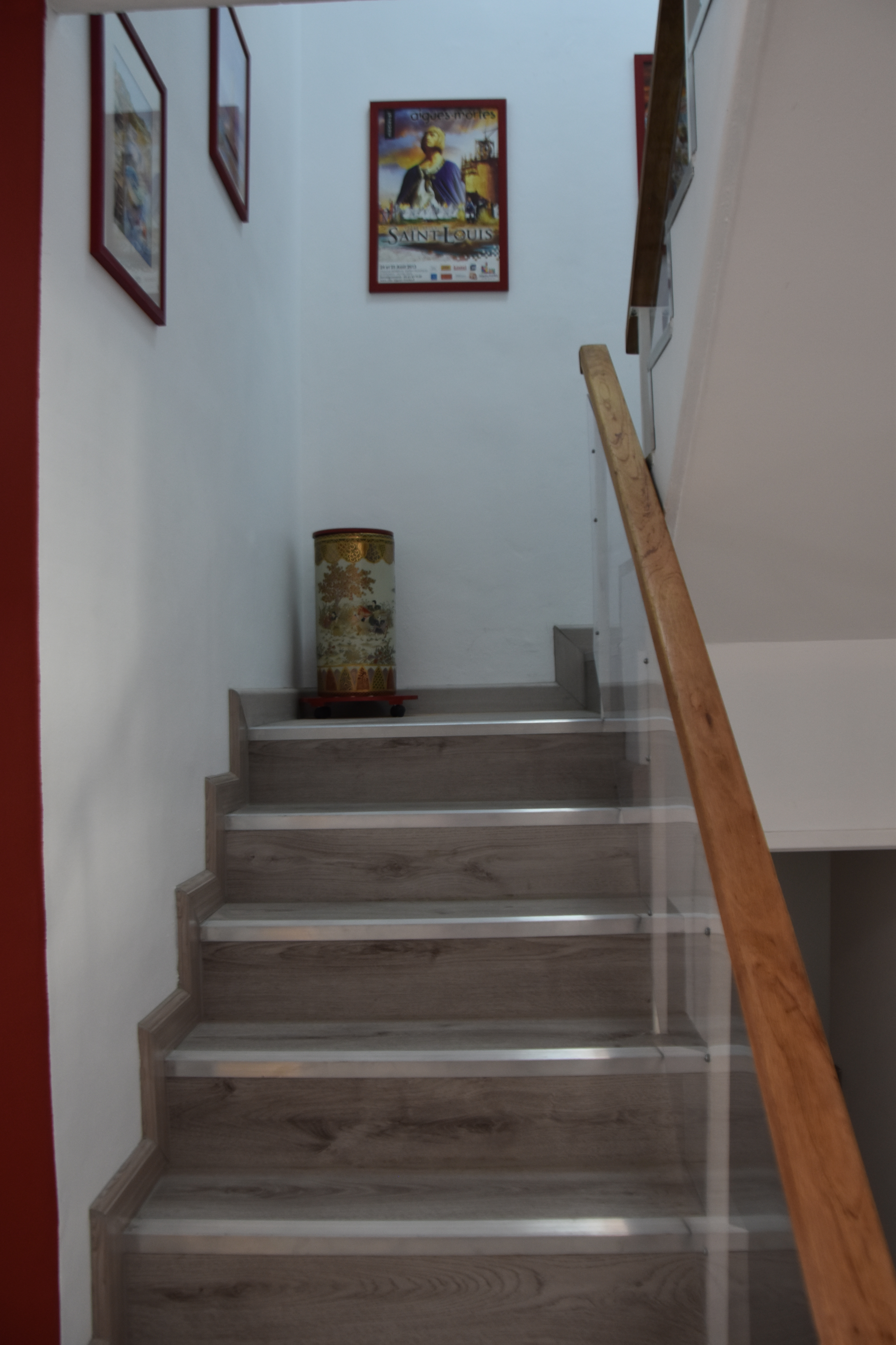 from there a stairwell with new raw wood and perspex balustrade and laminate floring on the stairs, leads to the upper landing
