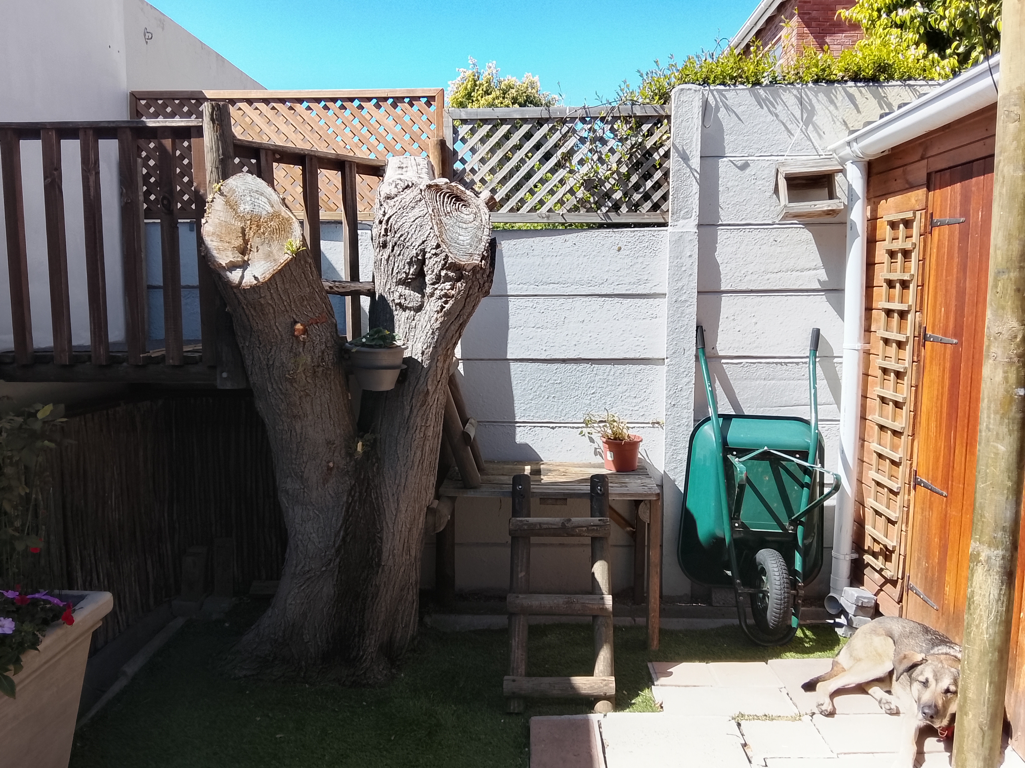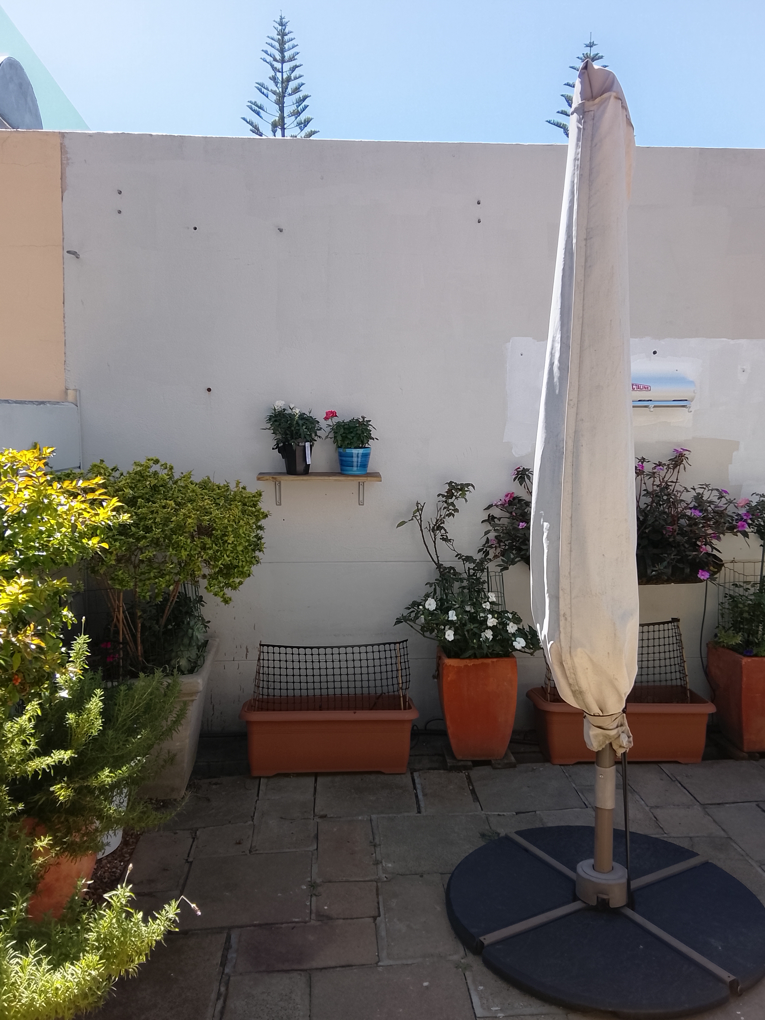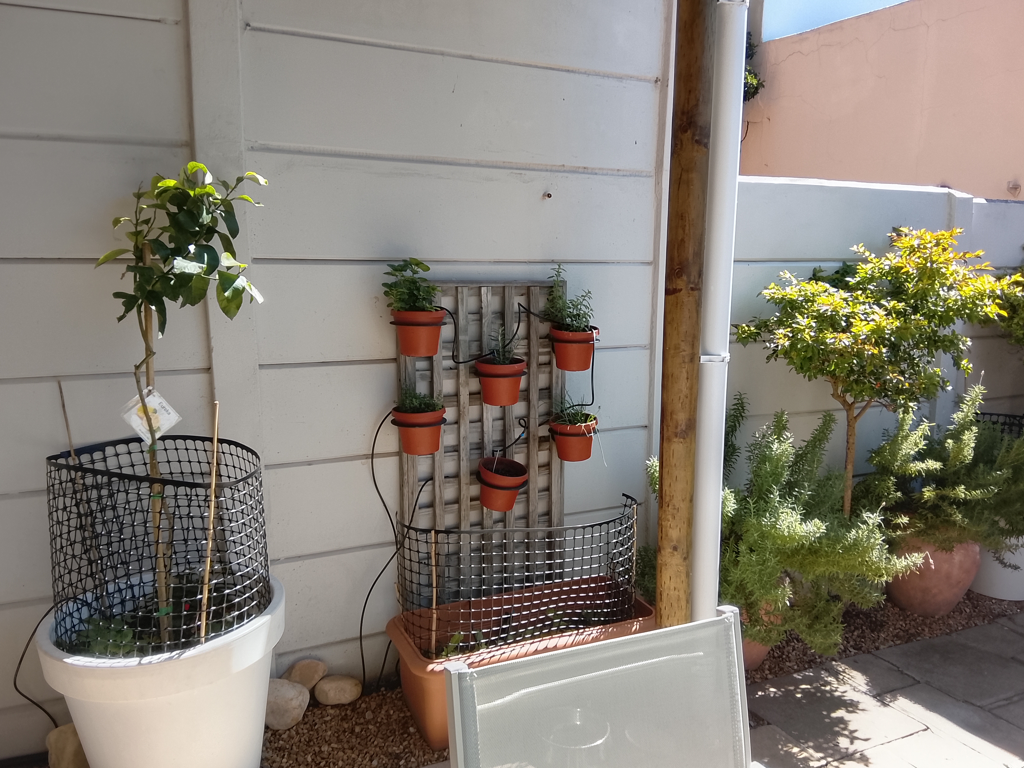 24th. Next job the little garden where I have installed more pots. One hosts a Eureka Limon Tree which fruits all year, others hold individual herbs or beds of rocket, basil, salad greens and stawberries. I am awauting cherry tomatoe plands which should be available next week. I have installed an irrigation system on a timer which needs a bit of tweeking but basically works. Overall quite pleasing.