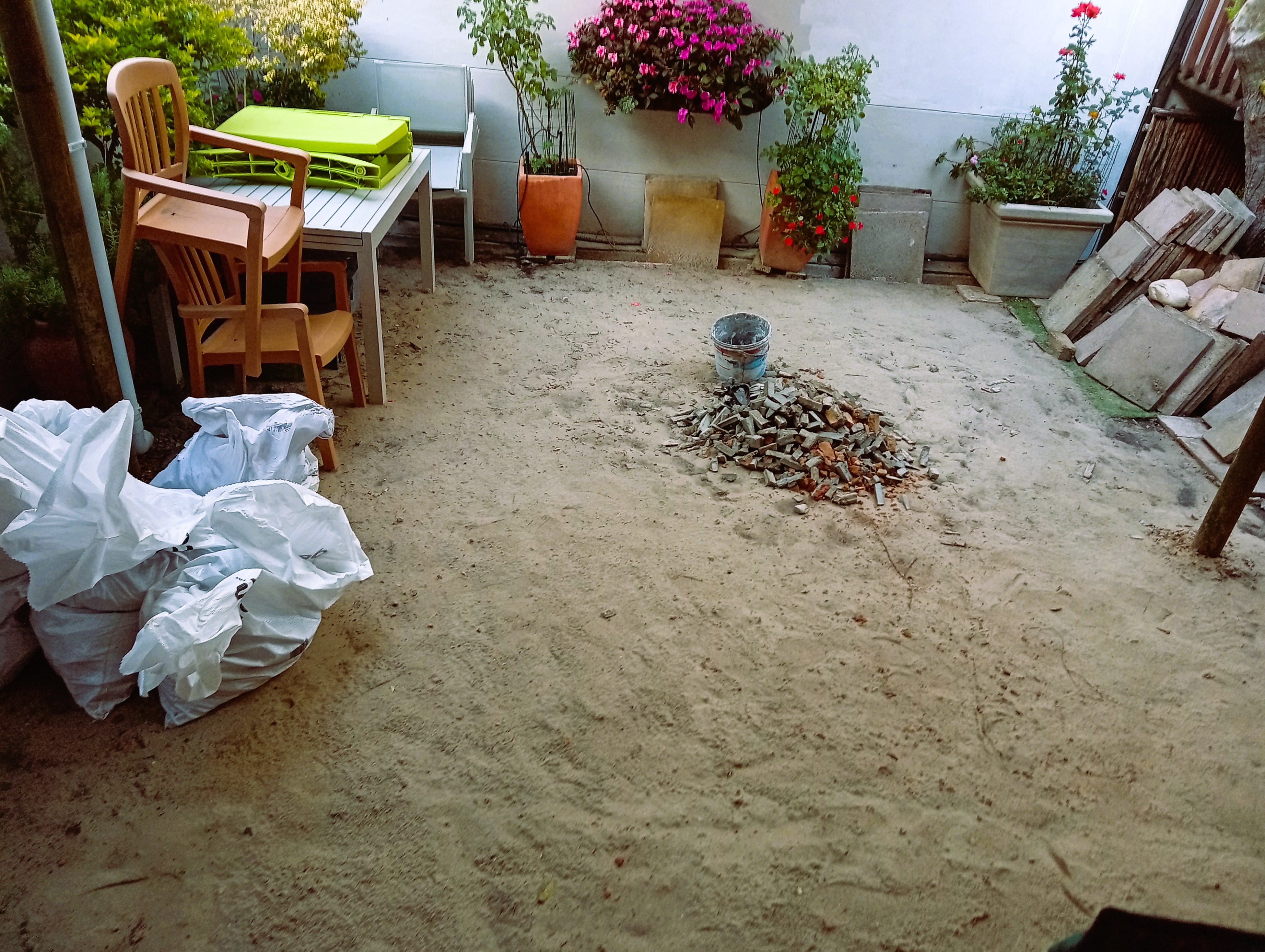 Workmen came in to re-lay the paving in the back yeard. First step was to lift the existing pavers leaving a right mess. Hopefully it wont be long before it is sorted!