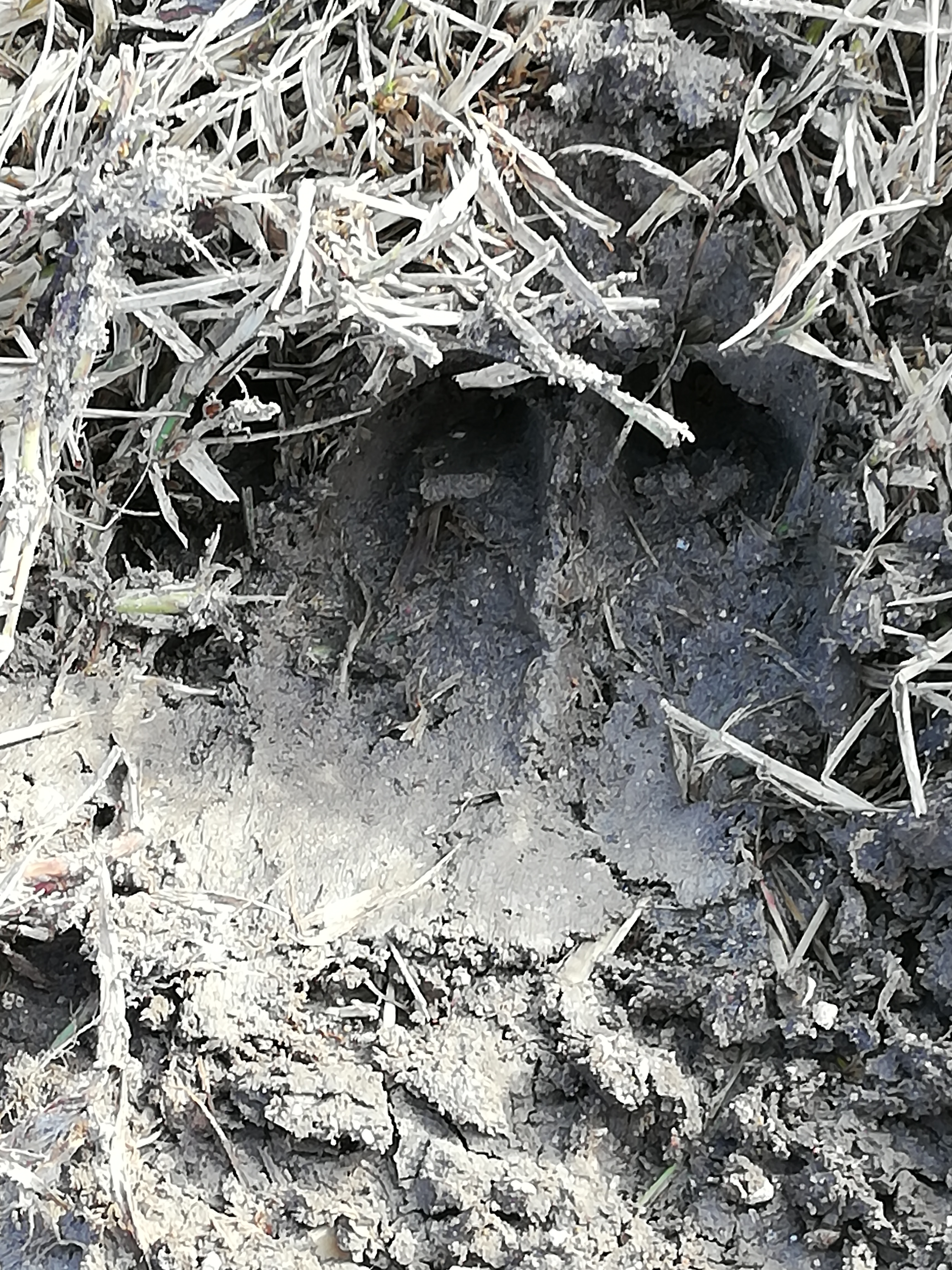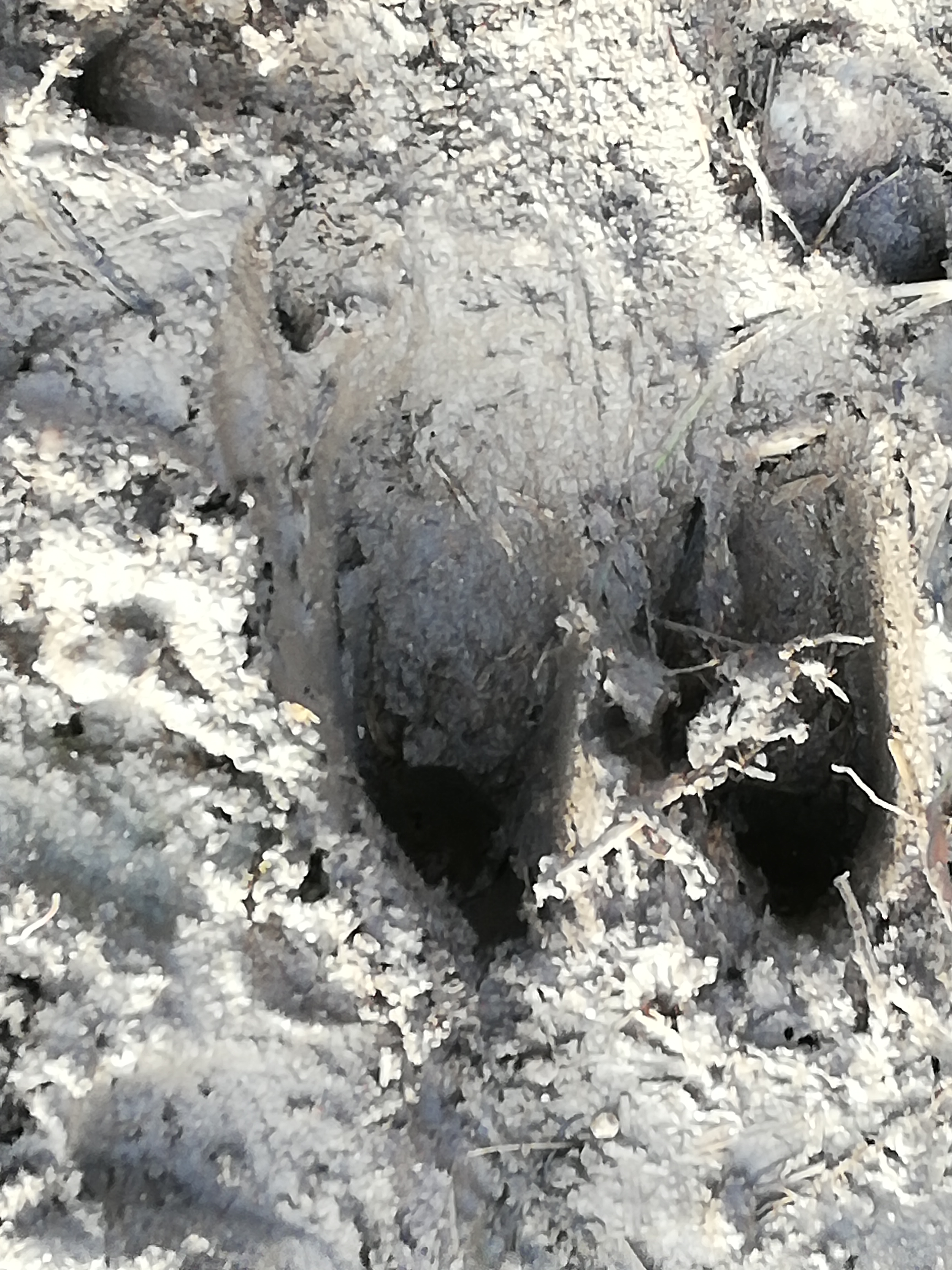 2nd. For the last two days in warm sunshine Cassidy and I have been crossing the fields to the hamlet of Chantier, pictured above, traversing the village and coming back down to Meschers through the fields again. Today I spotted a set of distinct Wild Boer prints in the mud!