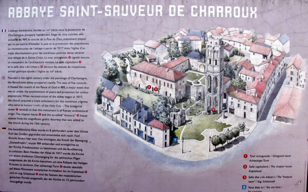 17th After catching up on a bit of work in the morning we moved out around mid day with a brief stop at Charroux to view the C10th Abbay and Charlemagne tower. The Abbay is a complete ruin and only the feet of the missing columns give a sense of its previous grandeur. There is also a large medieval covered market.